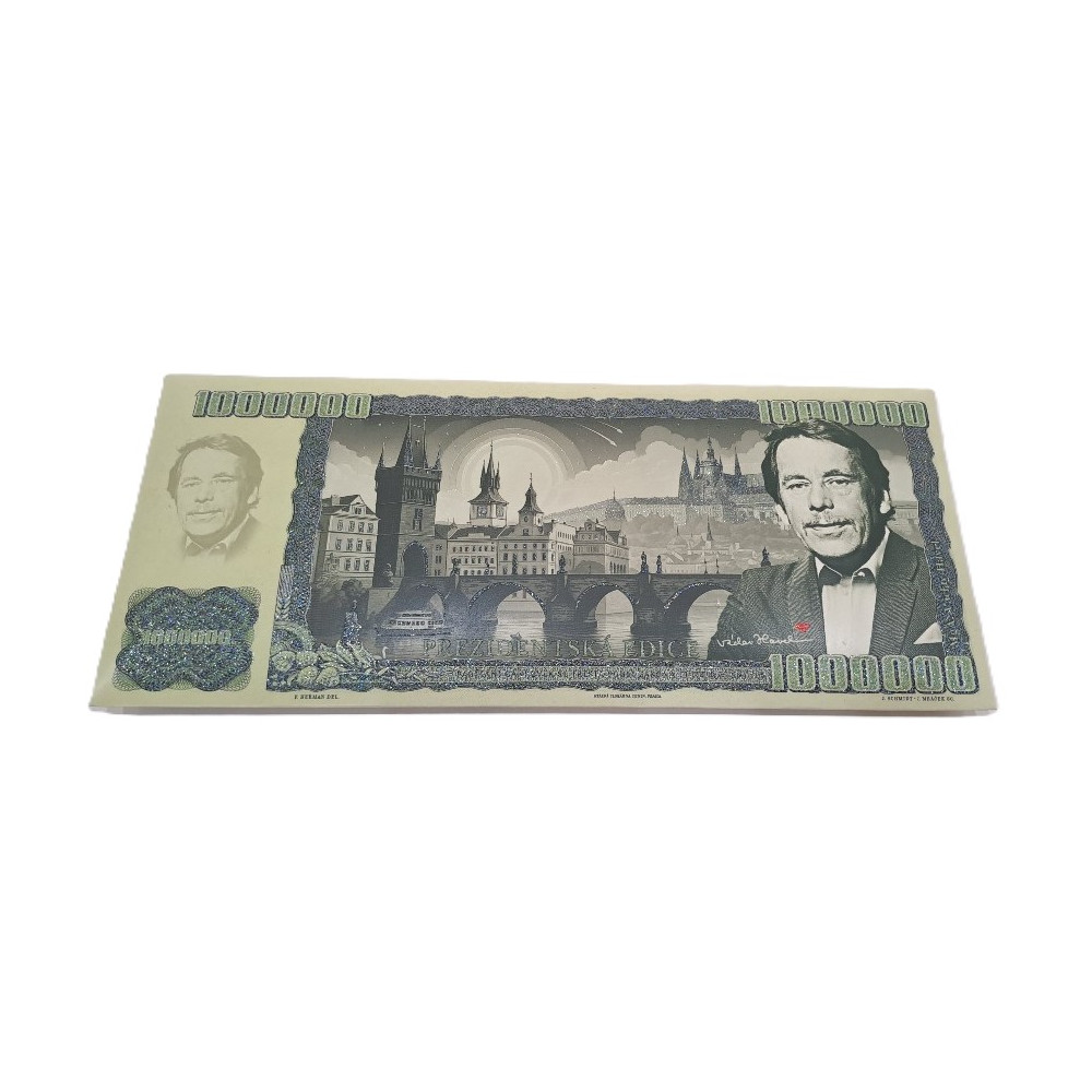 Tabulka mléčné belgické čokolády s motivem bankovky 1.000.000 Kč jako prezidentská edice s Václavem Havlem. Čokoláda je tak zabalena v papírovém obale s potiskem této bankovky.