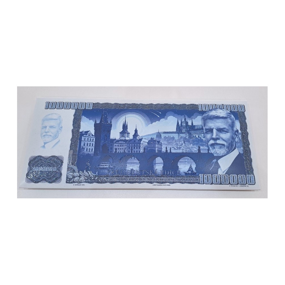 Tabulka mléčné belgické čokolády s motivem bankovky 1.000.000 Kč jako prezidentská edice s Petrem Pavlem. Čokoláda je tak zabalena v papírovém obale s potiskem této bankovky.