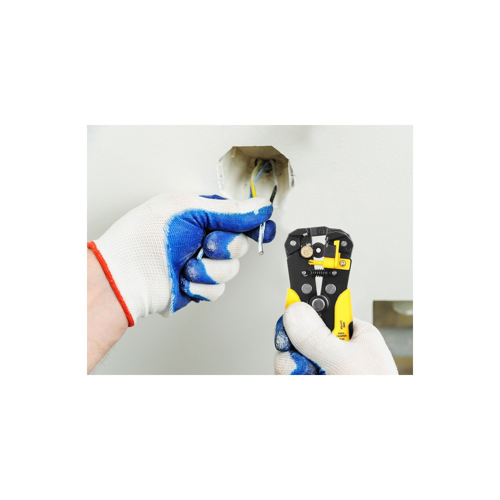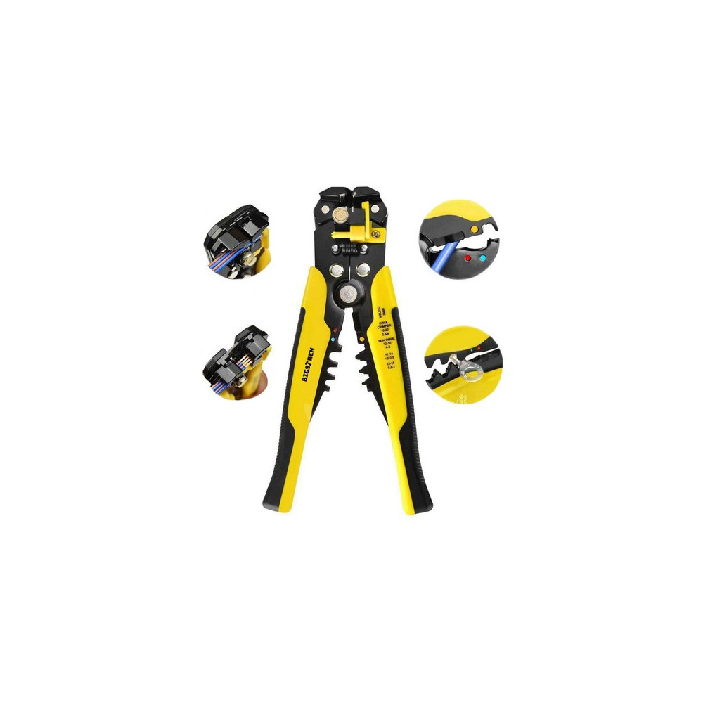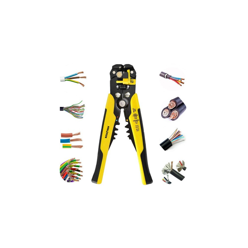 Kleště na odizolovávání kabelů značky Bigstren. Tento praktický nástroj vám umožní rychle a přesně odstranit izolaci z jednožilových nebo vícežilových vodičů. Další užitečnou funkcí odizolovaích kleští je stříhání vodičů. Čepel o délce 11 mm se nachází mezi rukojetí nástroje. Chcete-li přestřihnout vodič podobné nebo menší šířky, stačí jej vložit mezi čepele a pevně stisknout. Pomocí těchto kleští můžete také lisovat izolované koncovky konektorů a koncovky bez izolační vrstvy na vodičích o průřezu od 1,5 mm2 do 6 mm2.