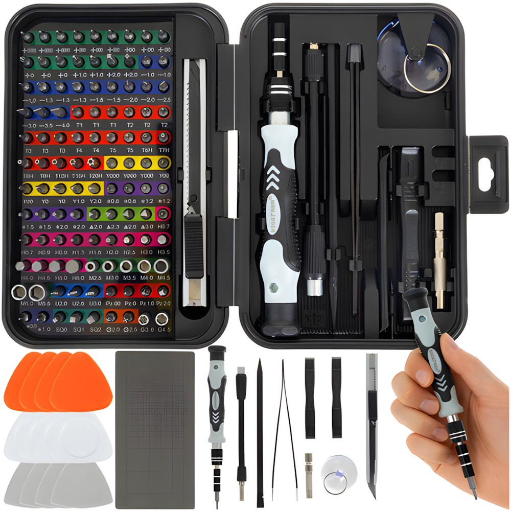 Profesionální sada přesných nástrojů obsahuje vše potřebné pro opravy elektroniky, mobilních telefonů, počítačů, notebooků, brýlí, hodinek, a dalších jemných zařízení. Tato komplexní 133dílná sada vám umožní bezpečně a efektivně rozebrat a opravit různé typy zařízení bez jejich poškození.