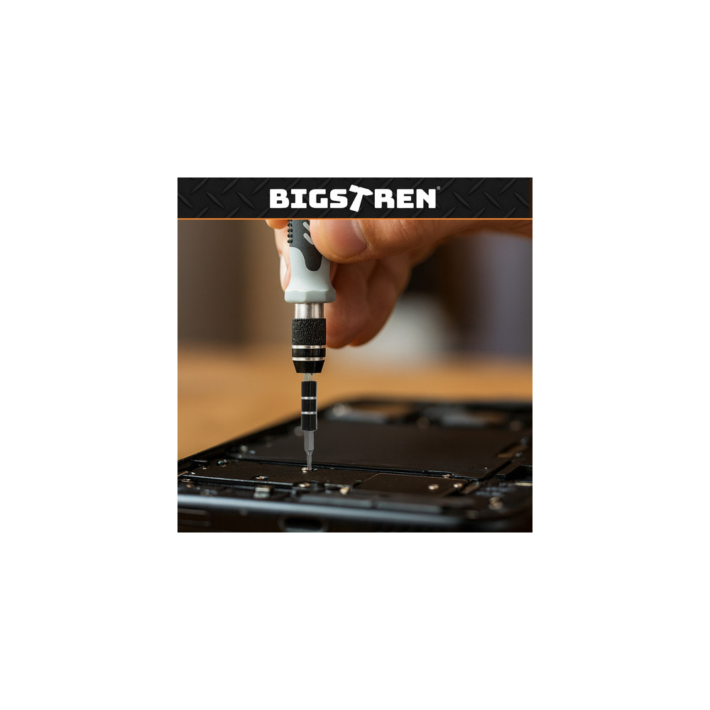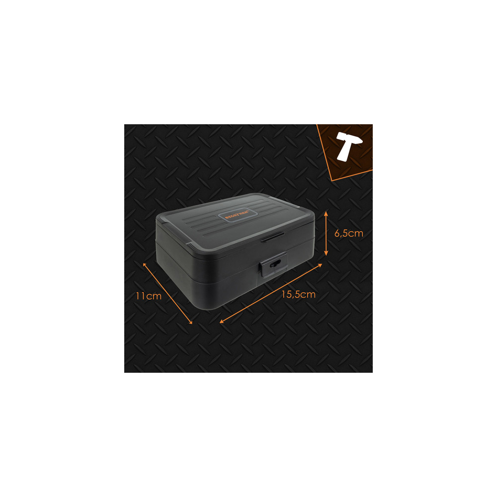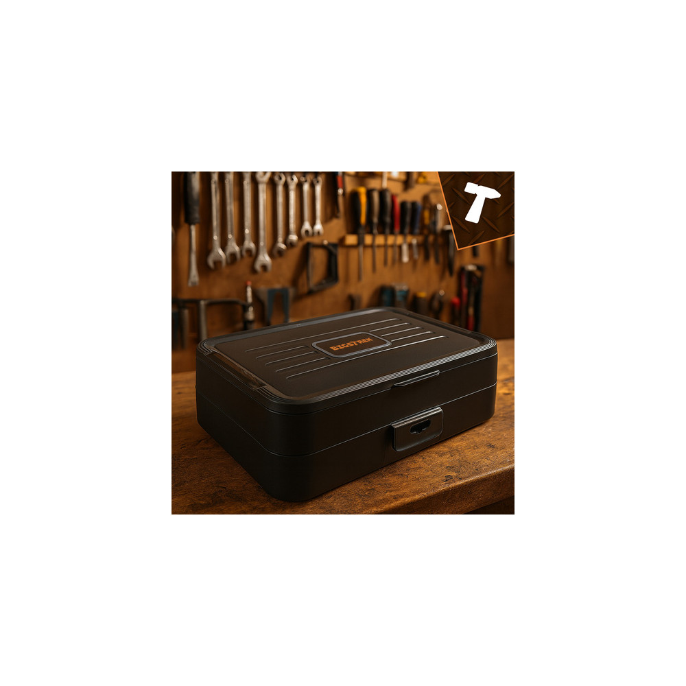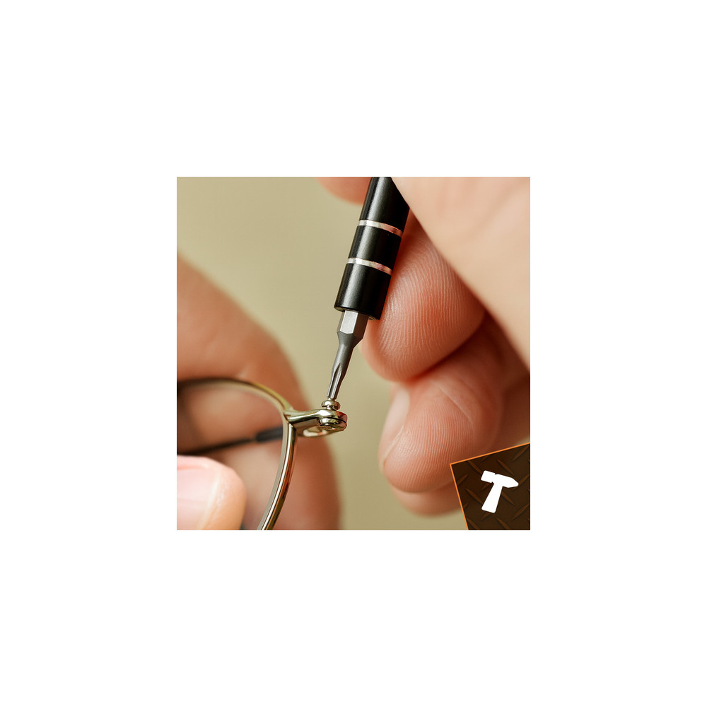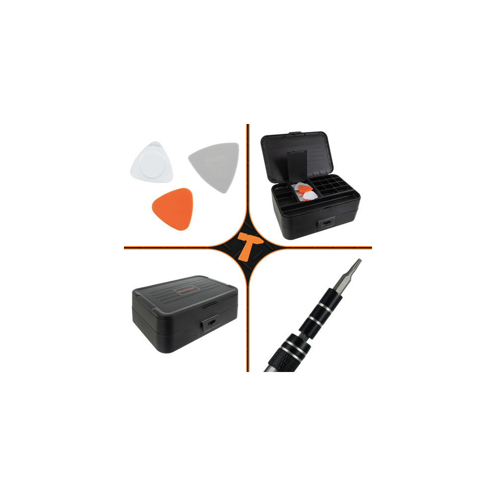Součástí jsou magnetické šroubováky, široký výběr bitů, pinzety, páčidla, přísavka na displeje, antistatické nástroje a flexibilní prodlužovací nástavec. Nářadí je úhledně uspořádáno v praktickém a odolném kufříku, který umožňuje snadné přenášení a udržení pořádku.