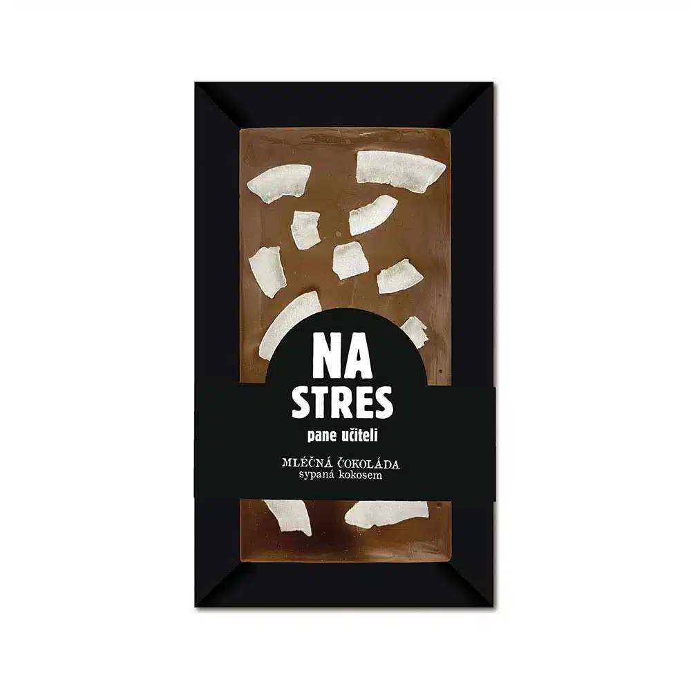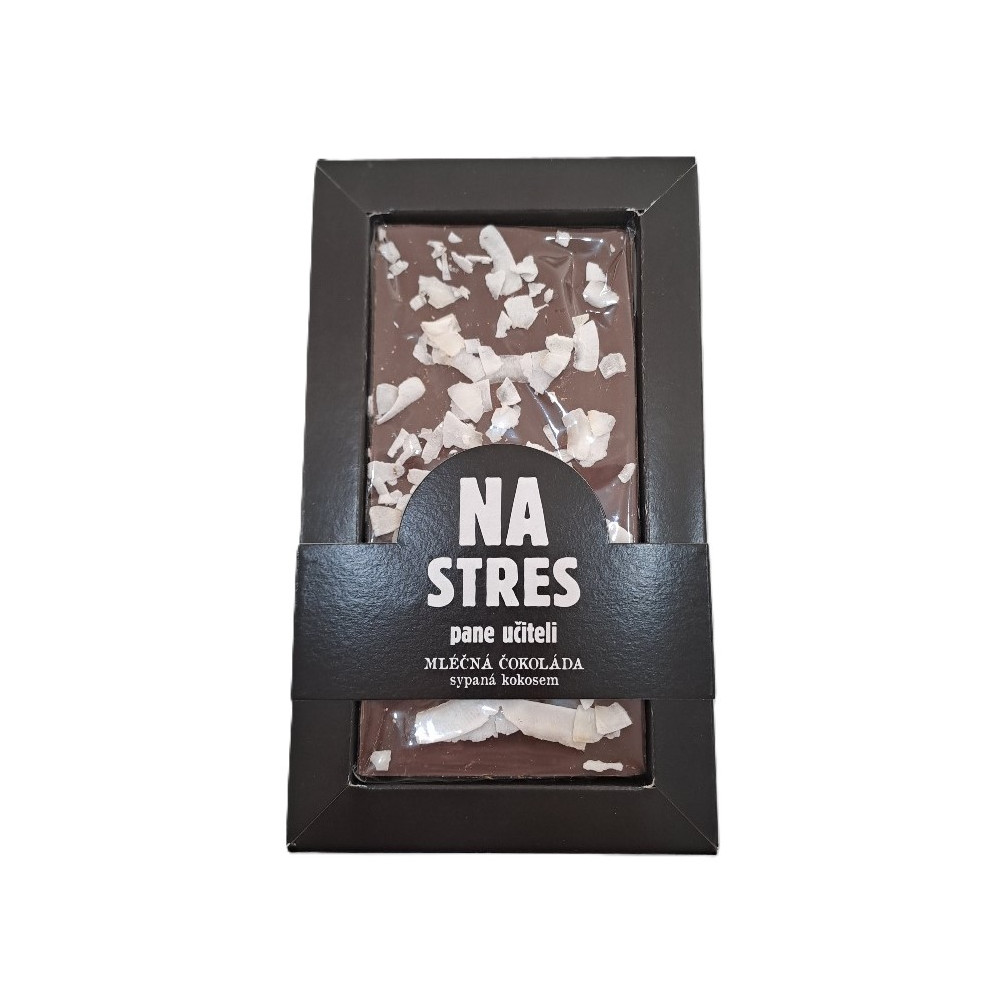 Dárková ručně vyráběná sypaná čokoláda 80 g – mléčná a kokosové lupínky – na stres pro pana učitele. Extra jemná výběrová čokoláda s výraznou chutí a vysokým podílem kakaového másla.