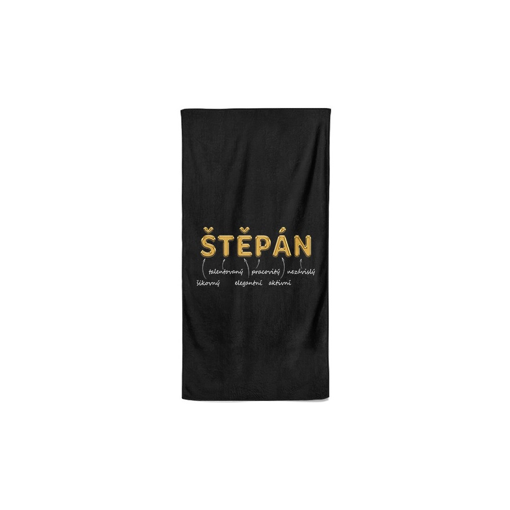 Luxusní osuška v černé barvě s vlastním jménem. Osuška má velký rozměr a materiál je velmi příjemný na dotek a díky speciální technice výroby, kdy se smísí BA a PES vlákna.