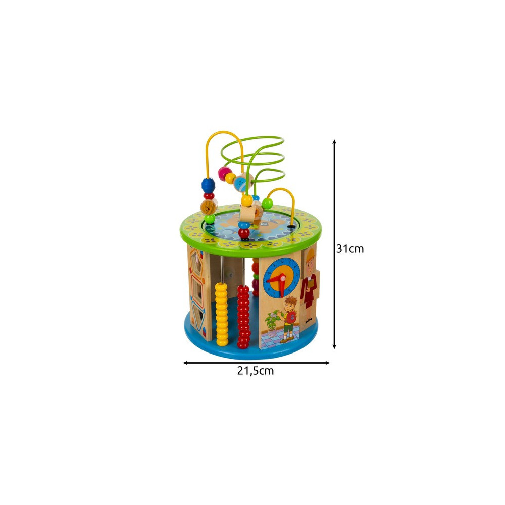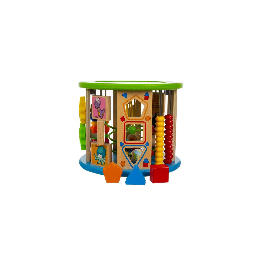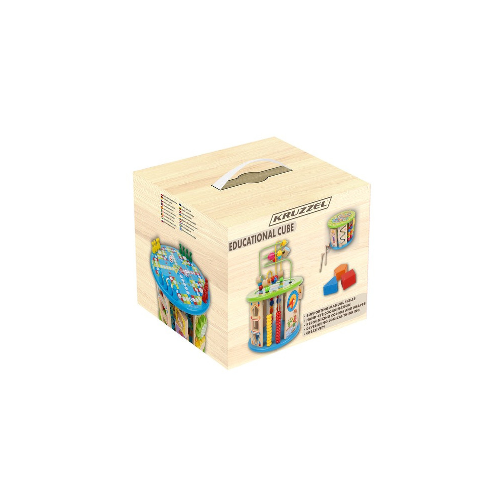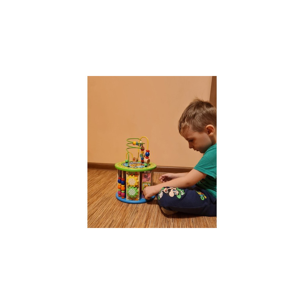 Dřevěná vzdělávací kostka pro děti s mnoha funkcemi a hrami. Kostka je navržena speciálně pro malé děti, nabízí 11 aktivit rozvíjejících motoriku, logické dovednosti, koordinaci, rozpoznávání barev a tvarů a další interaktivní prvky. Děti si procvičí například hodiny, počty nebo rozpoznávání barev.