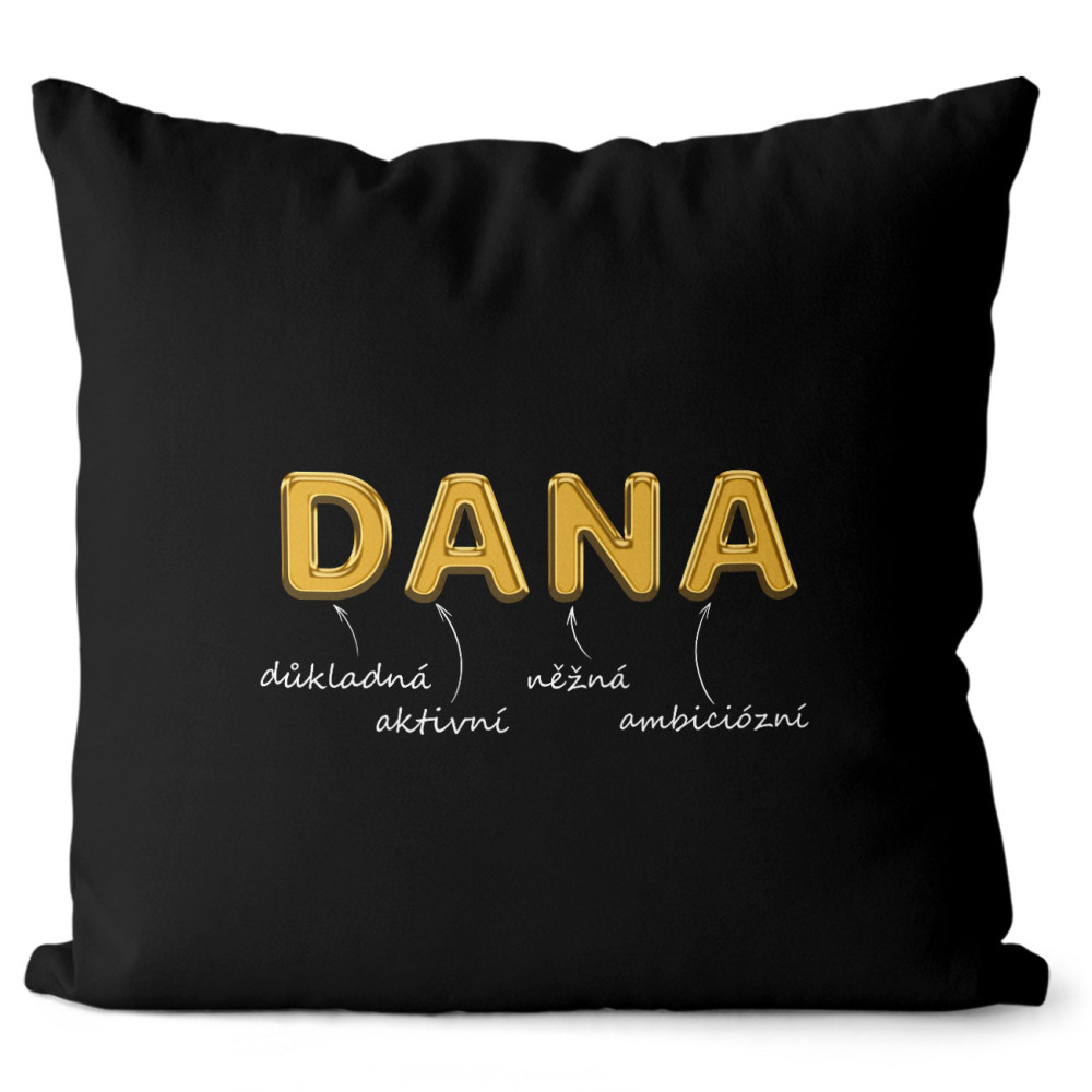 Originální polštářek v černé barvě s vlastním jménem. Má oboustranný potisk se zapínáním a vyjímatelnou výplň.