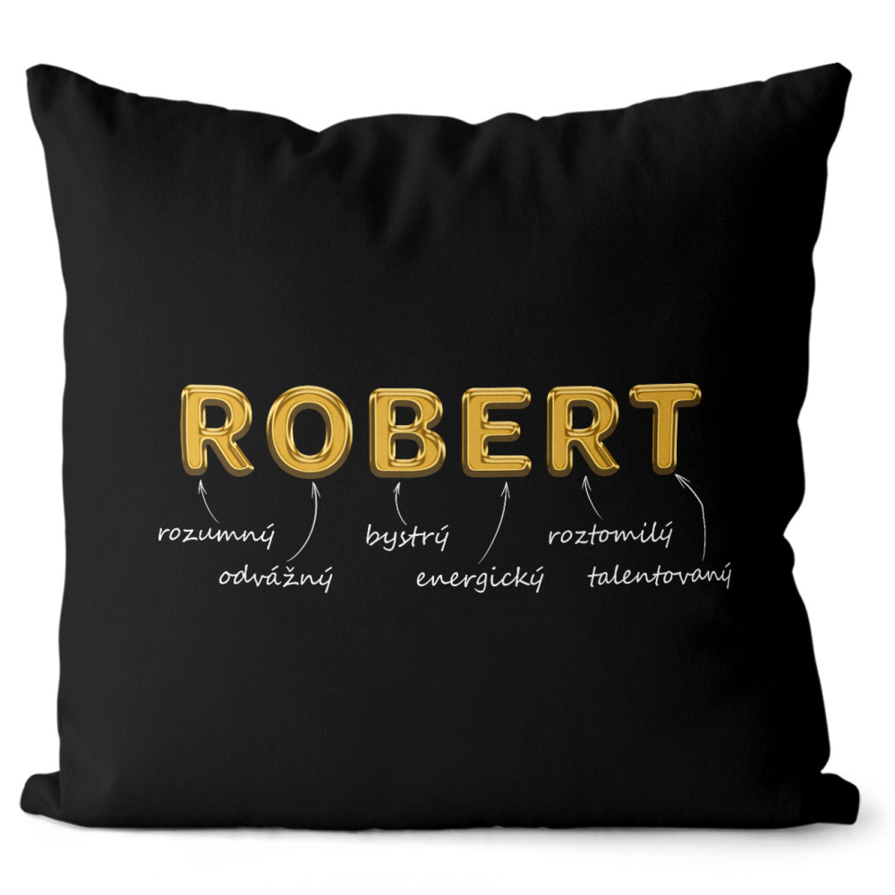 Originální polštářek v černé barvě s vlastním jménem. Má oboustranný potisk se zapínáním a vyjímatelnou výplň.