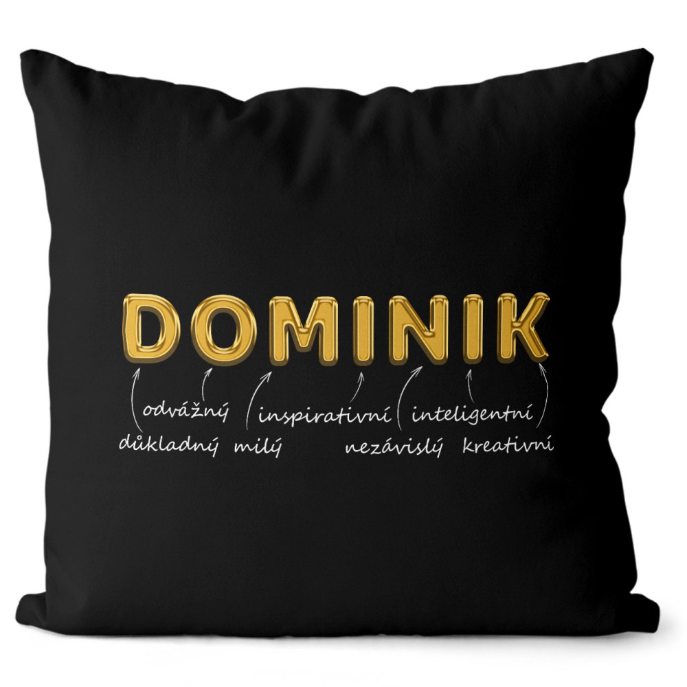 Originální polštářek v černé barvě s vlastním jménem. Má oboustranný potisk se zapínáním a vyjímatelnou výplň.