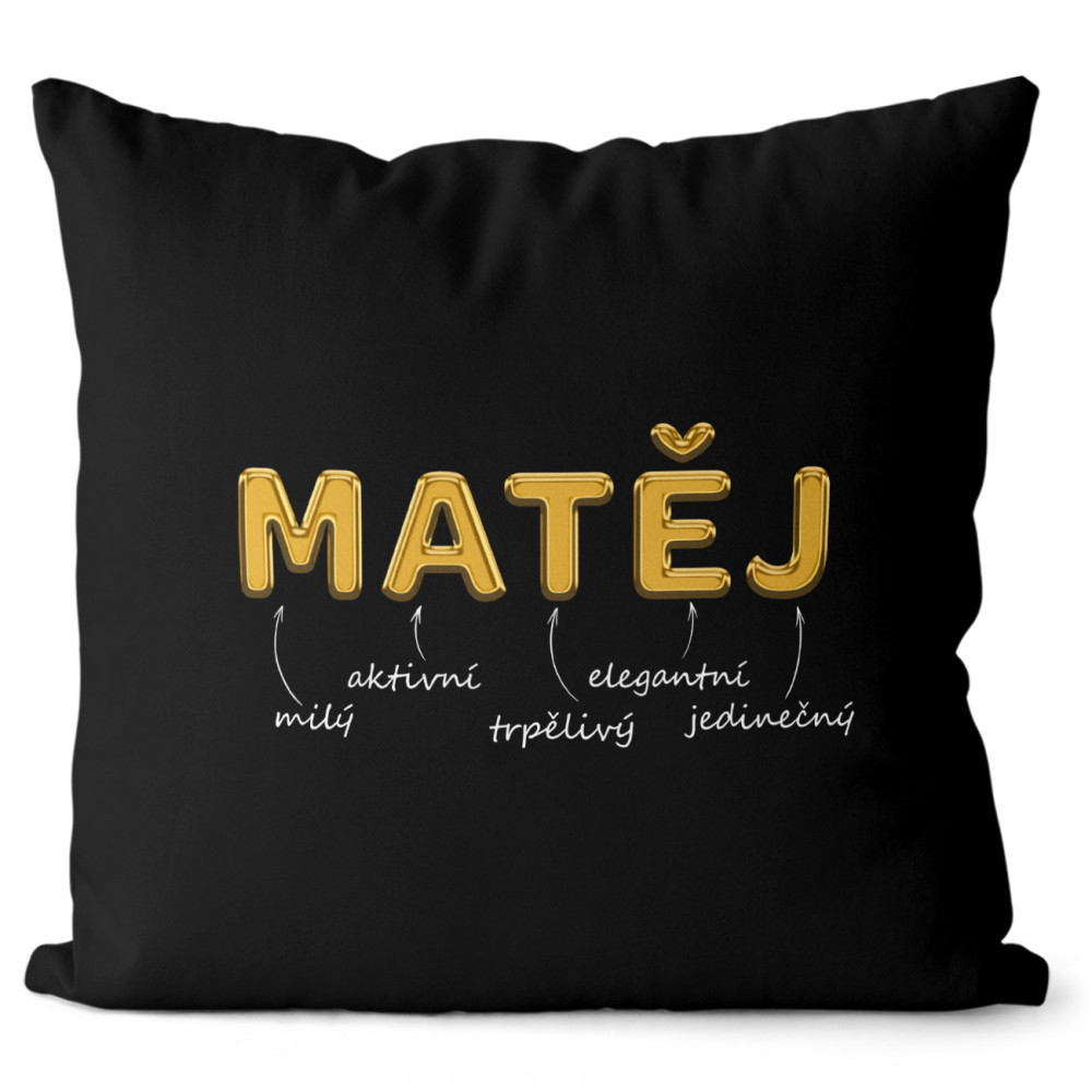 Originální polštářek v černé barvě s vlastním jménem. Má oboustranný potisk se zapínáním a vyjímatelnou výplň.