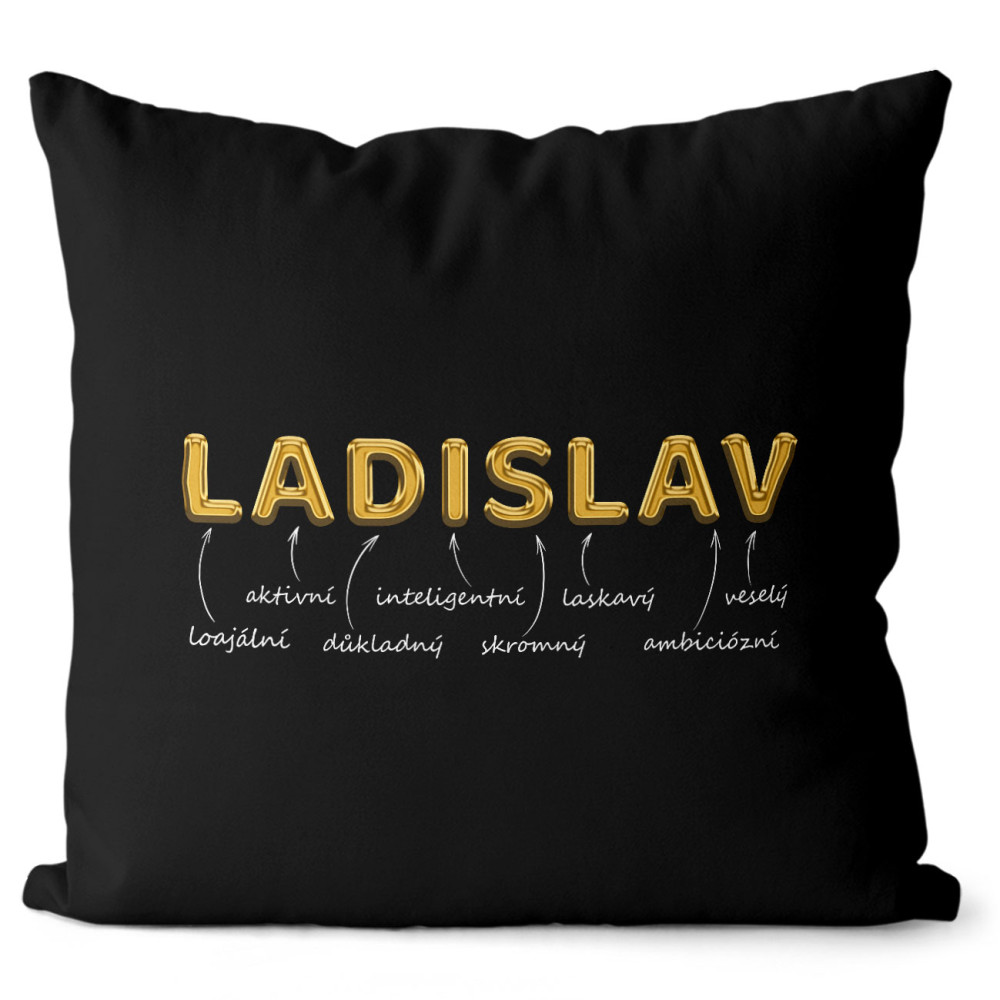 Originální polštářek v černé barvě s vlastním jménem. Má oboustranný potisk se zapínáním a vyjímatelnou výplň.