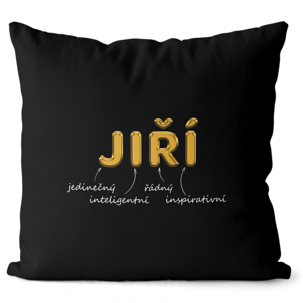 Originální polštářek v černé barvě s vlastním jménem. Má oboustranný potisk se zapínáním a vyjímatelnou výplň.
