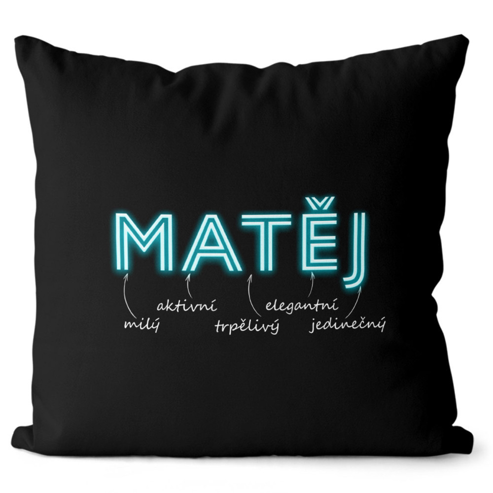 Originální polštářek v černé barvě s vlastním jménem. Má oboustranný potisk se zapínáním a vyjímatelnou výplň.