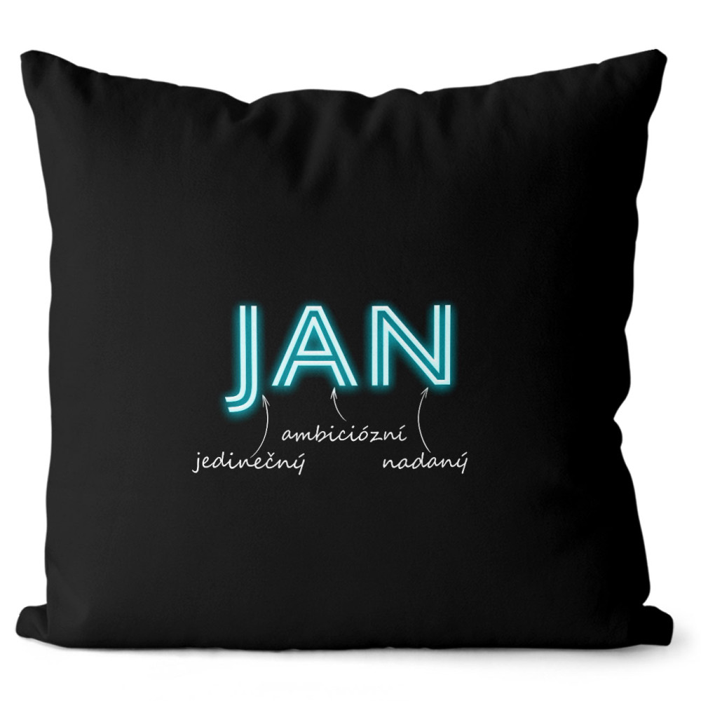 Originální polštářek v černé barvě s vlastním jménem. Má oboustranný potisk se zapínáním a vyjímatelnou výplň.