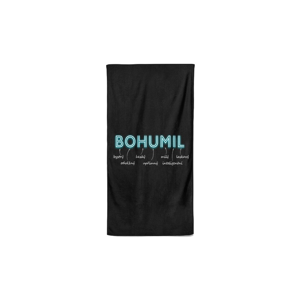 Luxusní osuška v černé barvě s vlastním jménem. Osuška má velký rozměr a materiál je velmi příjemný na dotek a díky speciální technice výroby, kdy se smísí BA a PES vlákna.