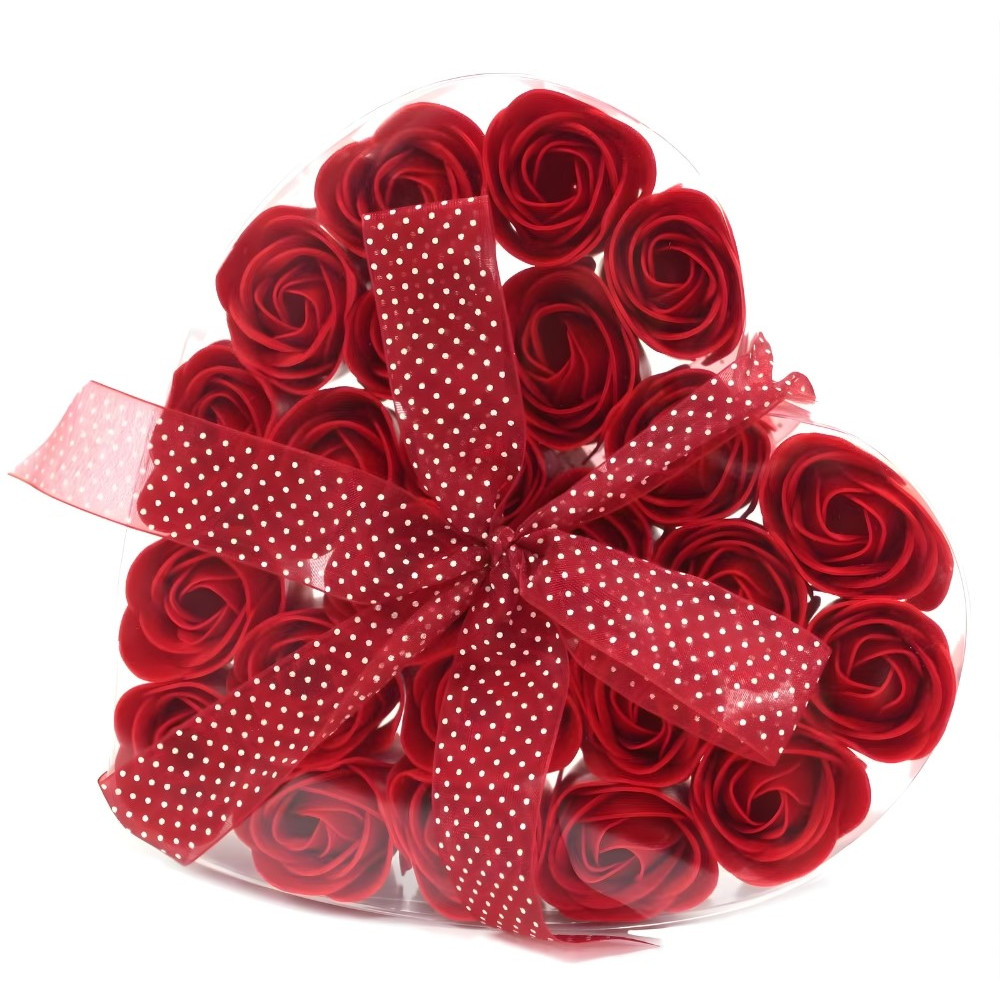 Mýdlové květy růže v dárkové krabičce srdce 24 ks červené