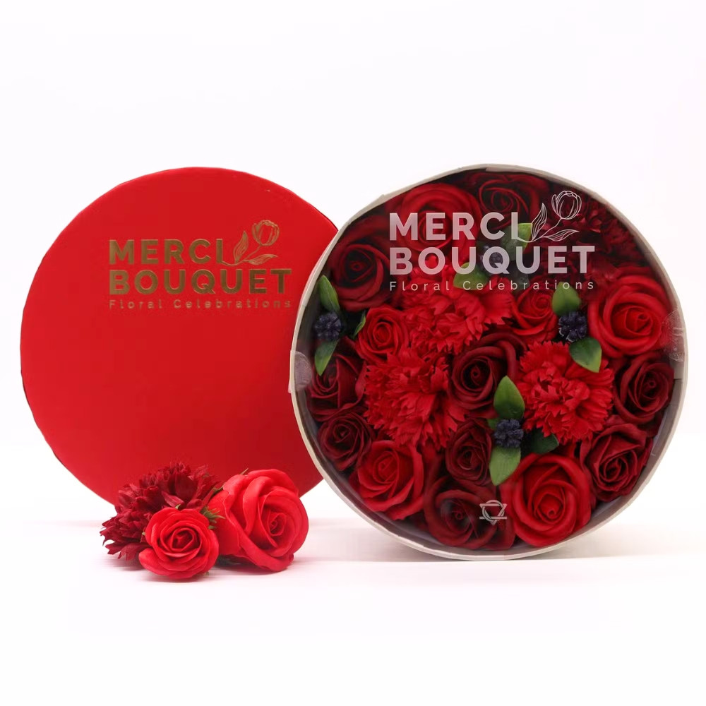 Dárkový box mýdlových květů kulatý červené růže