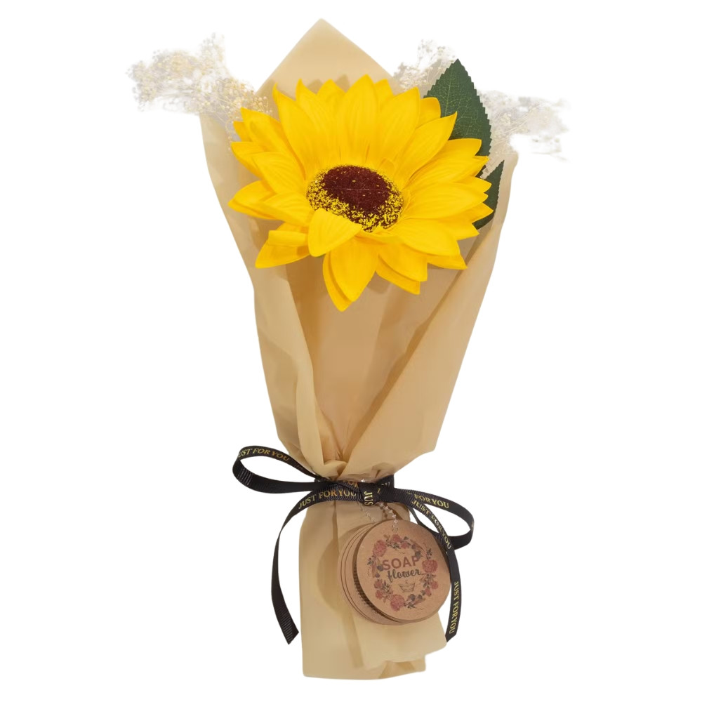Romantický pugét mýdlové slunečnice v dárkovém balení. Ideální dárek k narozeninám nebo jen tak z lásky pro radost. Mýdlové květy jsou vhodné pro romantickou koupel ve vaně. Jemná okouzlující vůně vytvoří příjemné chvilky relaxace.