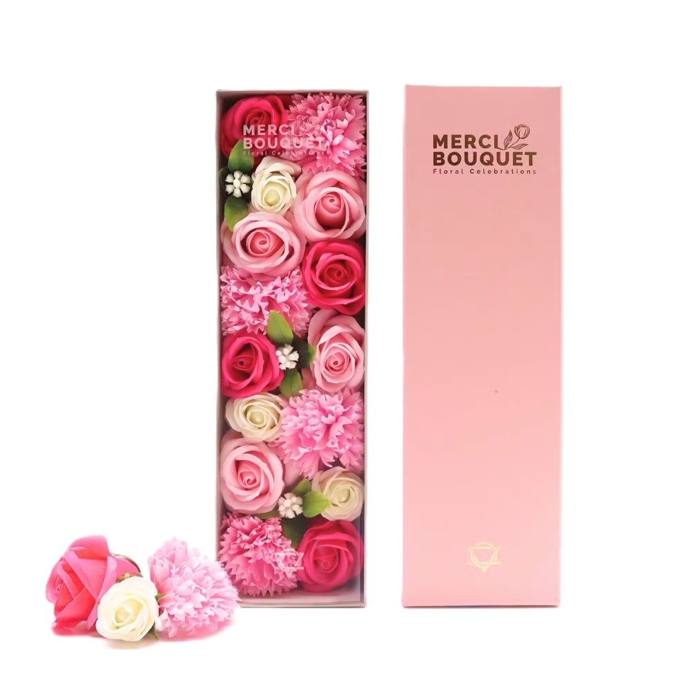 Romantické mýdlové květy v podlouhlém dárkovém boxu. Ideální dárek na Valentýna, k narozeninám a nebo jen tak z lásky pro radost. Mýdlové květy jsou vhodné pro romantickou koupel ve vaně. Jemná okouzlující vůně vytvoří příjemné chvilky relaxace. Krásné také jako dekorace, která nikdy nezvadne.