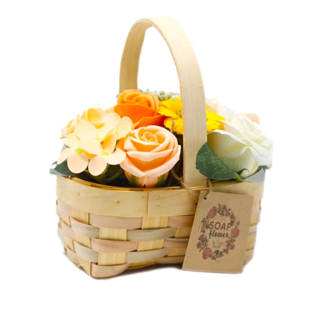 Kytice mýdlových květů v proutěném koši střední oranžová
