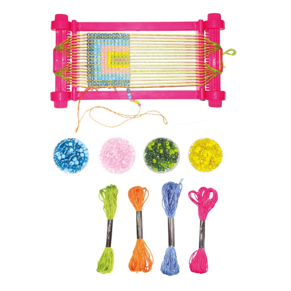 Sada obsahuje 4 barevné bavlnky, 4 barvy korálků a pletací stav.