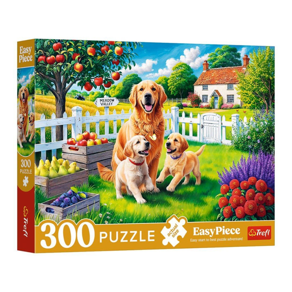 Puzzle s motivem Zlatých retrívrů na venkovské zahradě je ideální pro větší děti.
