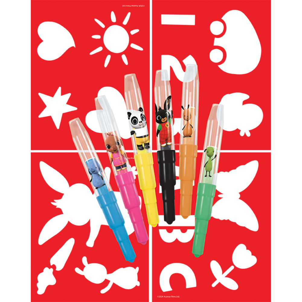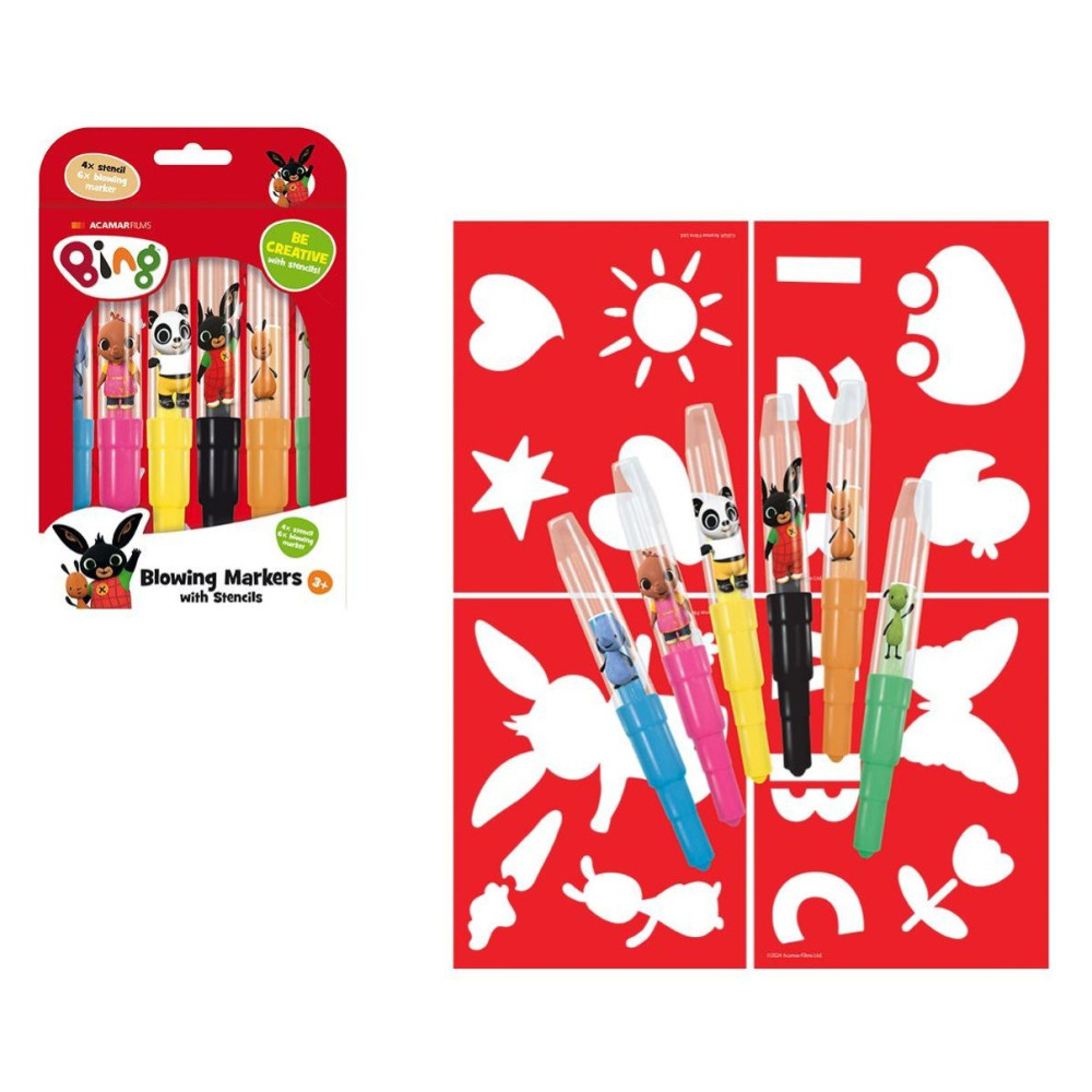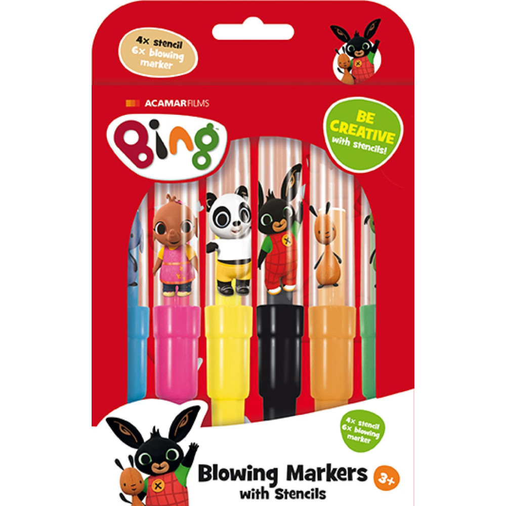 Foukací fixy s oblíbenou dětskou postavičkou Binga. Balení obsahuje 6 barevných foukacích fixů s potiskem a 4 barevné papírové šablonky v oblíbených motivech.