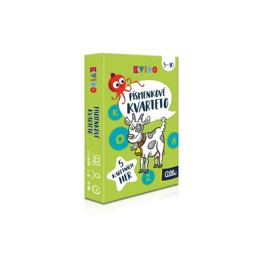 Písmenkové kvarteto z edice Kvído je karetní hra s krásnými ilustracemi, která děti od 5 let naučí naši abecedu. Seznamte děti s písmeny české abecedy pomocí zábavných her: písmenkové kvarteto, autobus nebo švindl. Z písmen lze také tvořit slova nebo věty. Na každé kartě je obrázek zvířete, jehož název na dané písmeno začíná. Písmenkové kvarteto rozvíjí slovní zásobu, logické myšlení a znalost české abecedy.