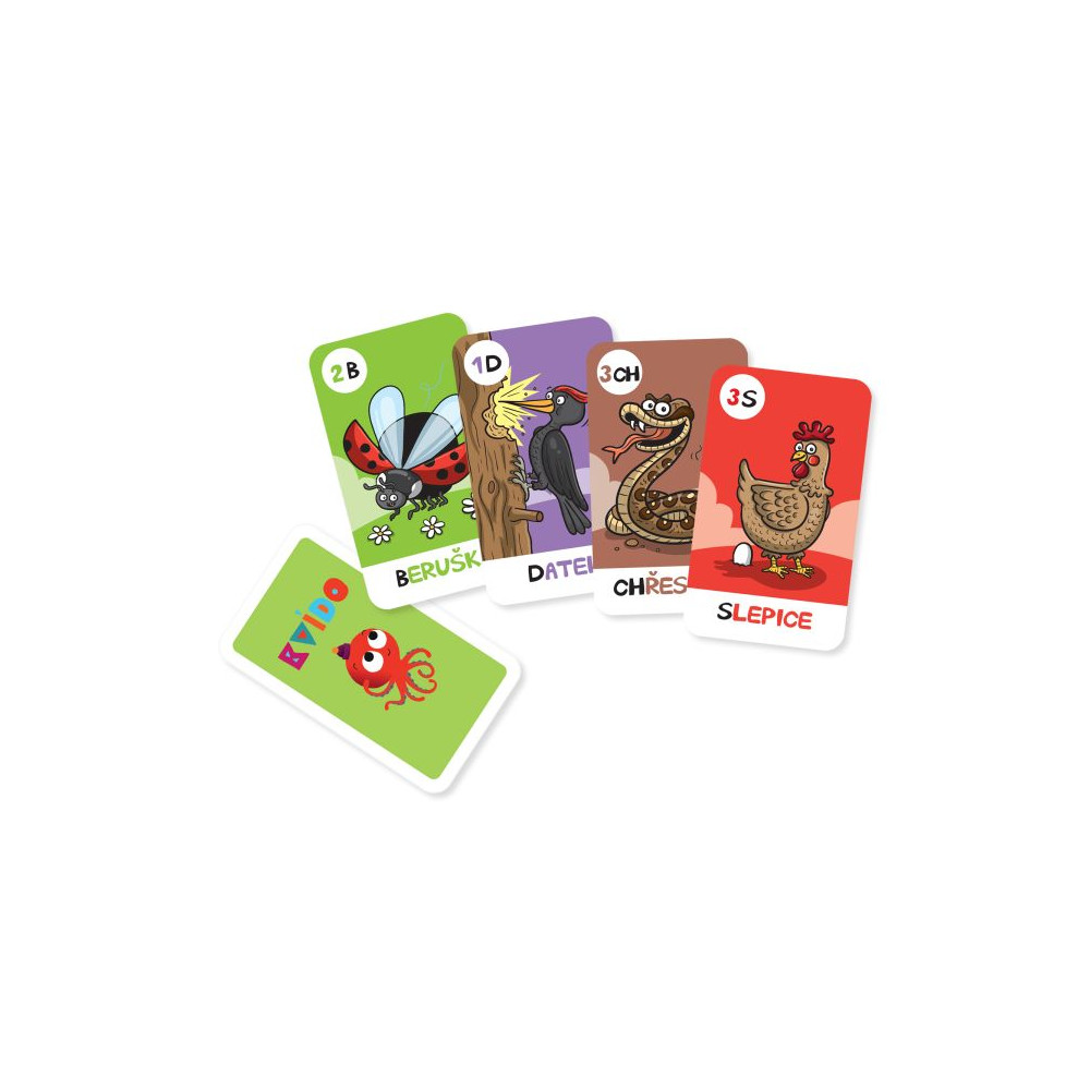 Hra Písmenkové kvarteto - Kvído obsahuje: 32 ilustrovaných karet zvířátek začínající na různá písmena české abecedy, pravidla na 5 her.