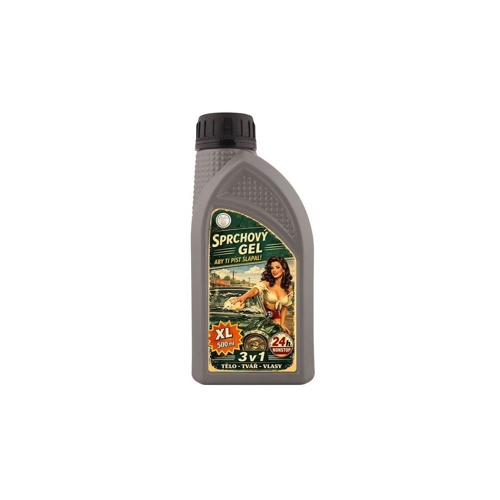 Retro sprchový gel pro muže 3v1 v industriální lahvi připomínající motorový olej. Motiv černovlásky a XL balení 500 ml vytváří originální dárek pro muže.