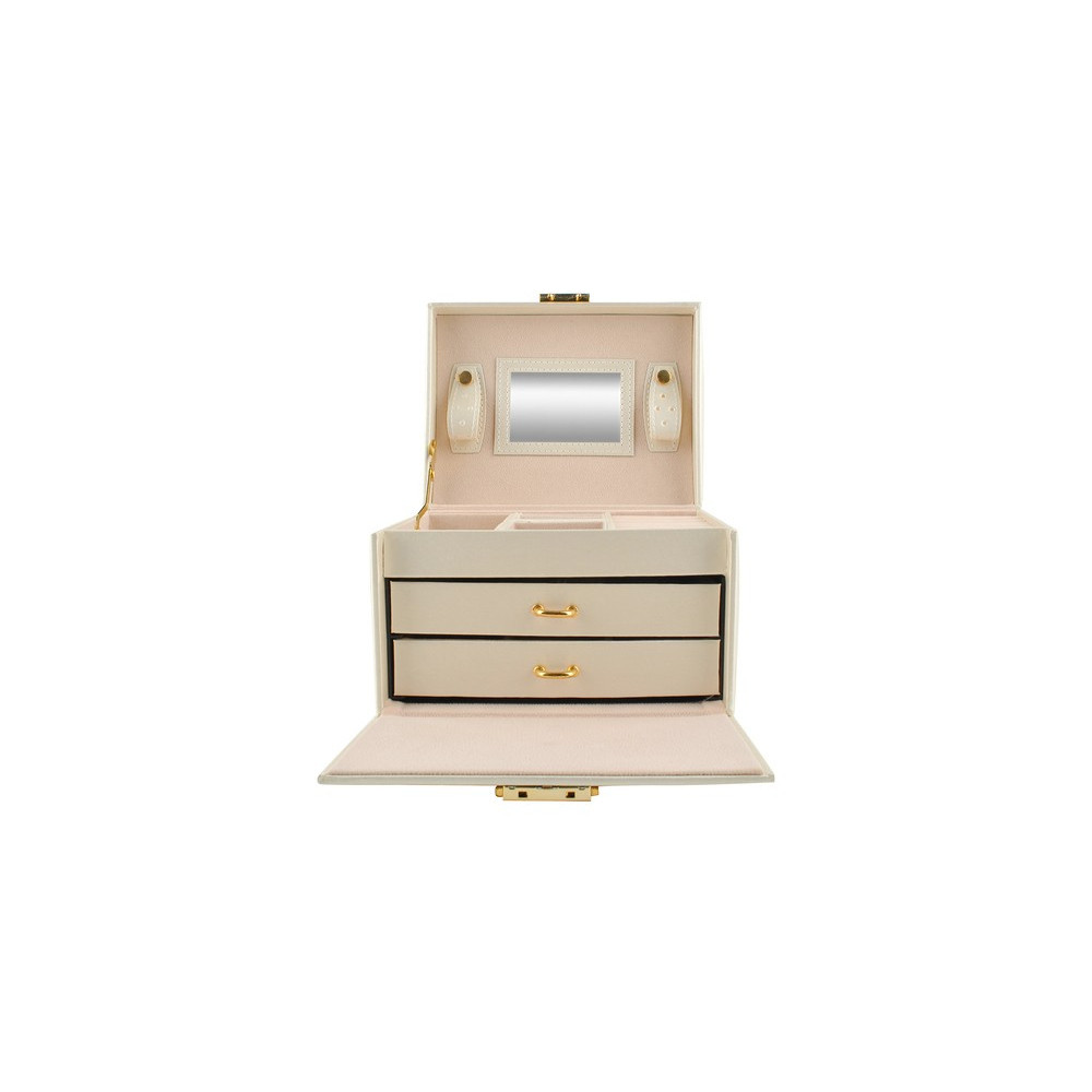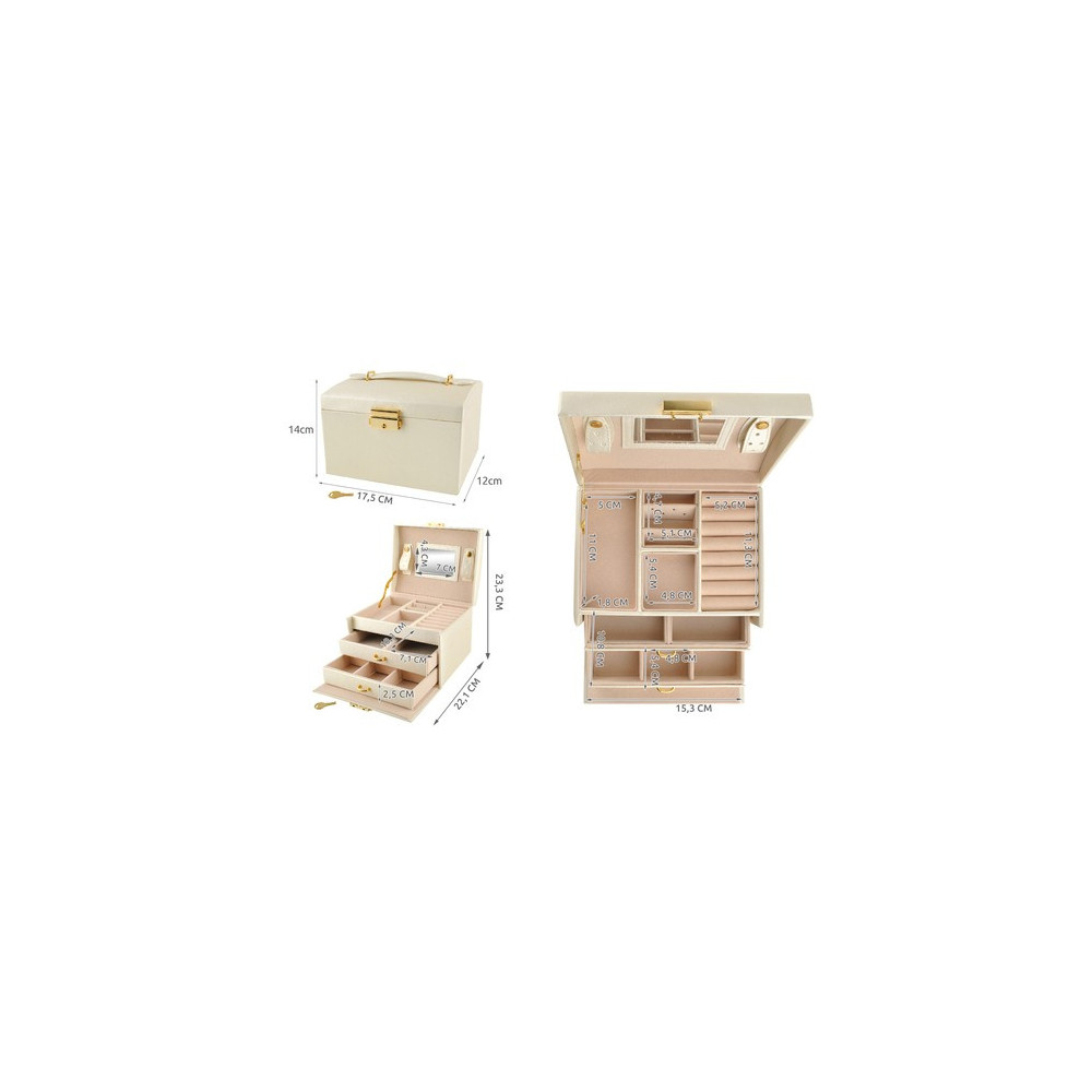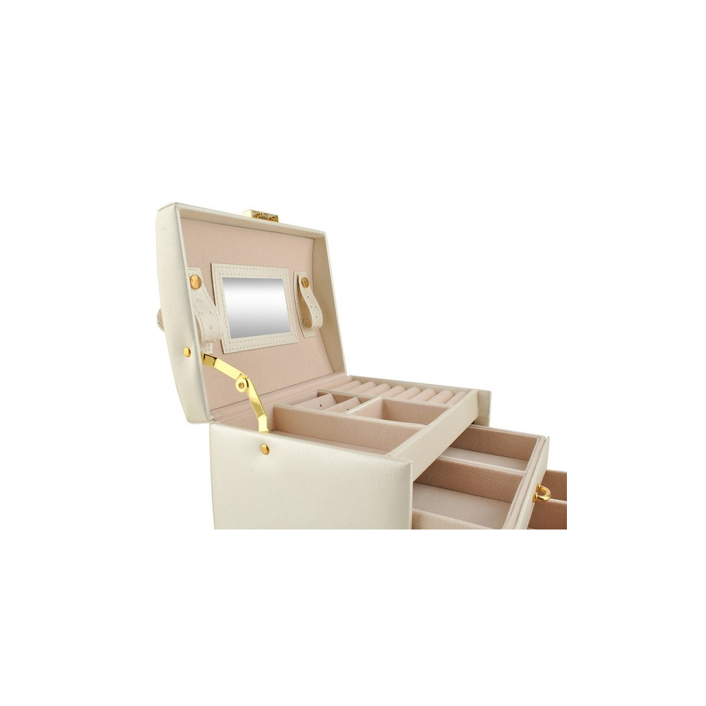 Prostorná šperkovnice se zrcadlem v béžové barvě s krémovým vnitřkem. Součástí je také zámek s klíčem pro uzamčení šprkovnice. Uvnitř je 20 různých přihrádek a výklenků. Přihrádky jsou vystlané měkkým materiálem, který chrání šperky před poškrábáním.