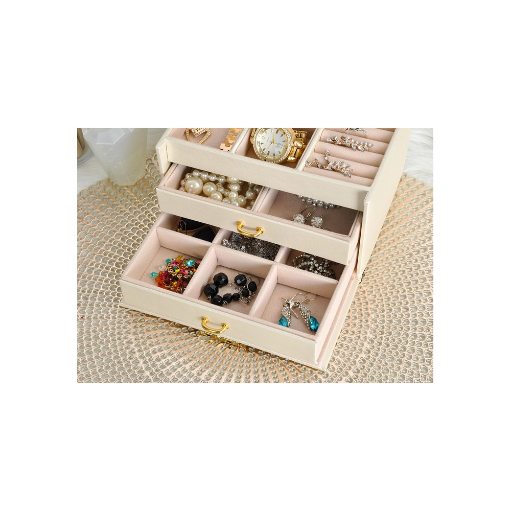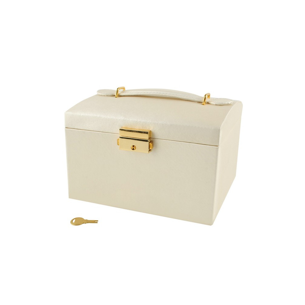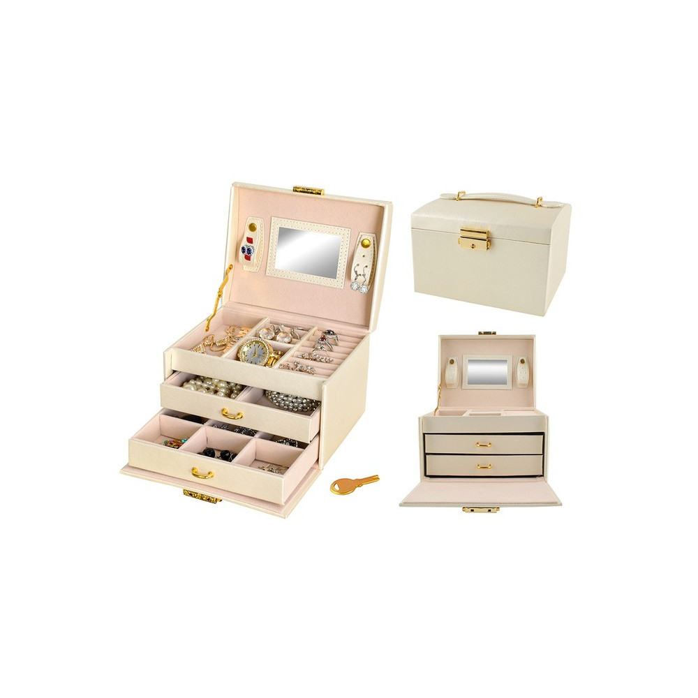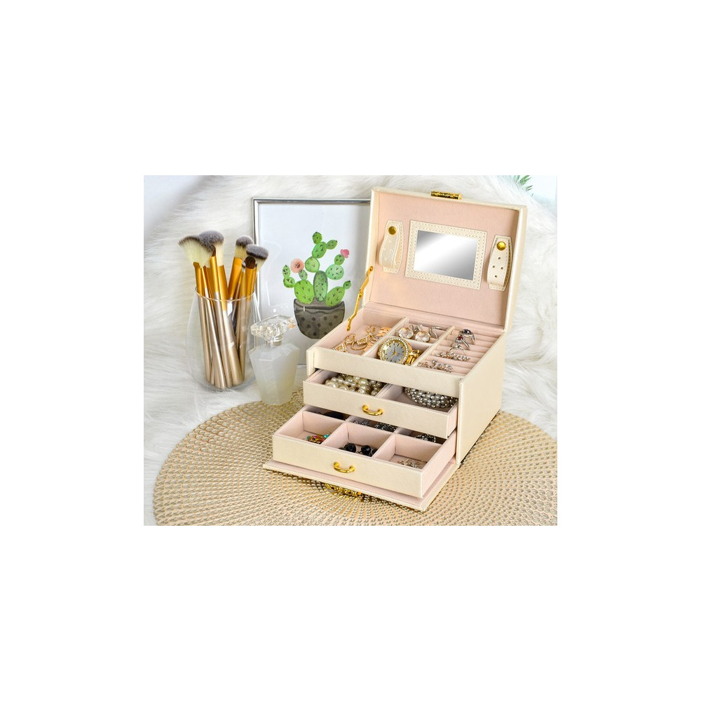 Prostorná šperkovnice se zrcadlem v béžové barvě s krémovým vnitřkem. Součástí je také zámek s klíčem pro uzamčení šprkovnice. Uvnitř je 20 různých přihrádek a výklenků. Přihrádky jsou vystlané měkkým materiálem, který chrání šperky před poškrábáním.
