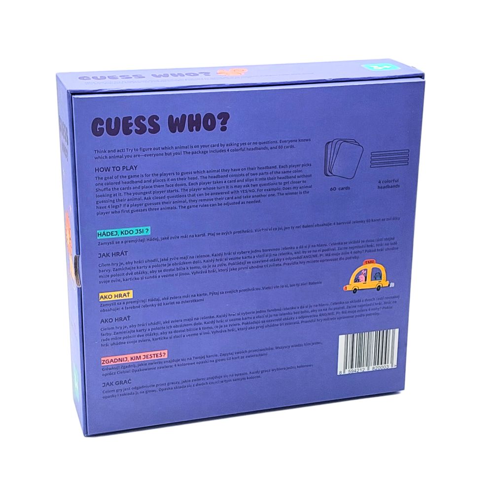 Hádej, kdo jsi je zábavná společenská hra, která přináší hodiny smíchu a učení pro celou rodinu. Hráči si nasadí čelenku s kartou a snaží se uhodnout, jakou postavu představují. Hra obsahuje 60 karet s obrázky i názvy v angličtině, což pomáhá při zábavném učení slovíček. Zábavná společenská hra Hádej, kdo jsi je ideální pro rodinné večery a setkání s přáteli.