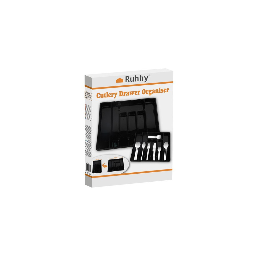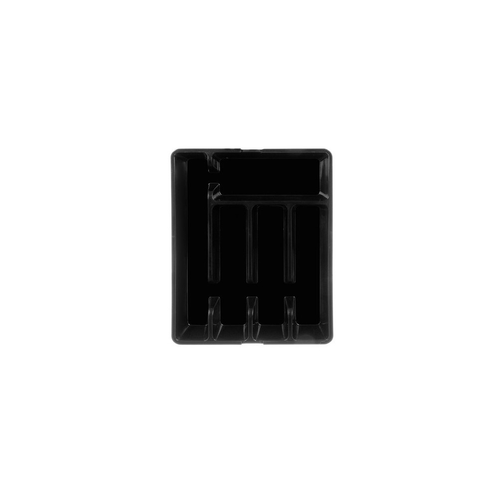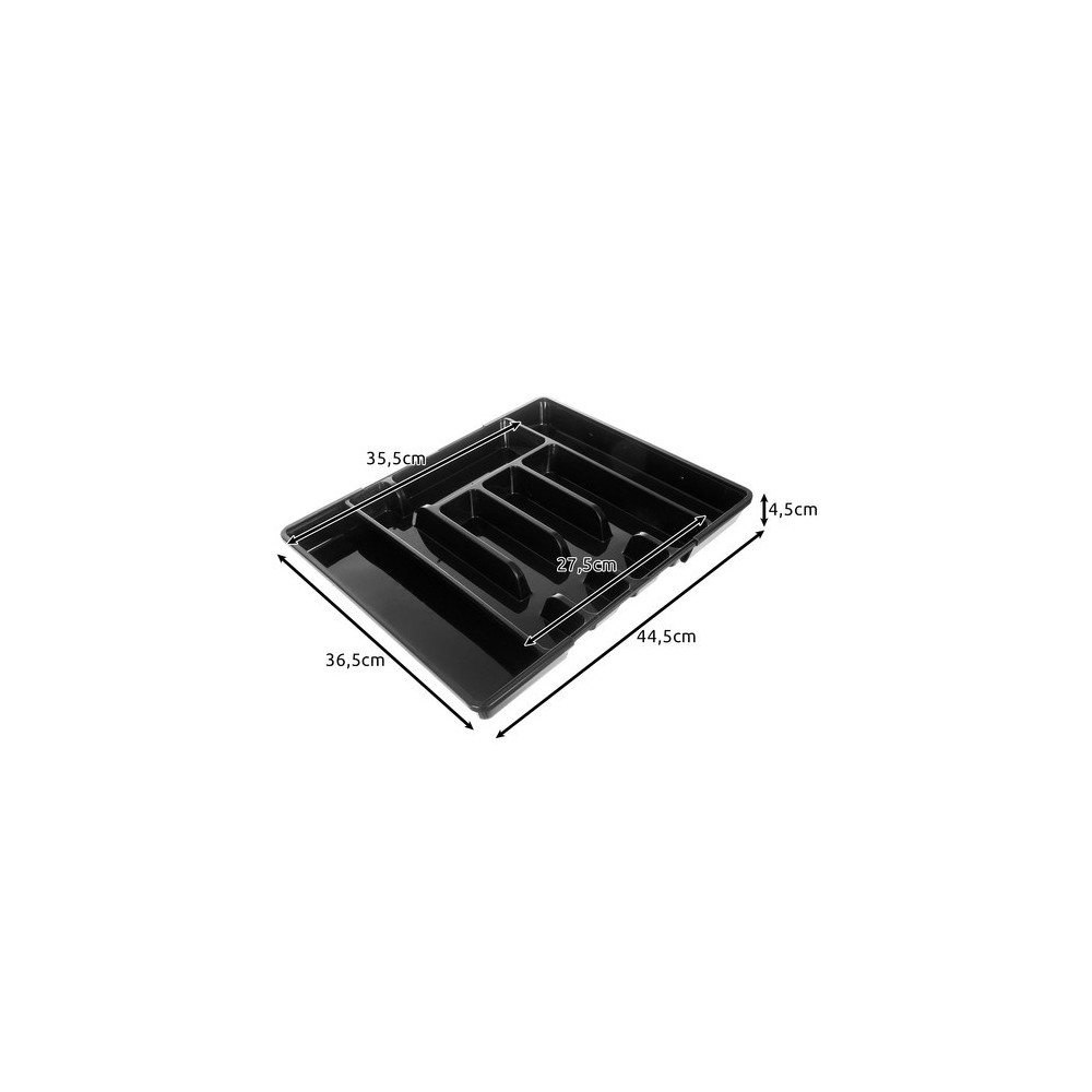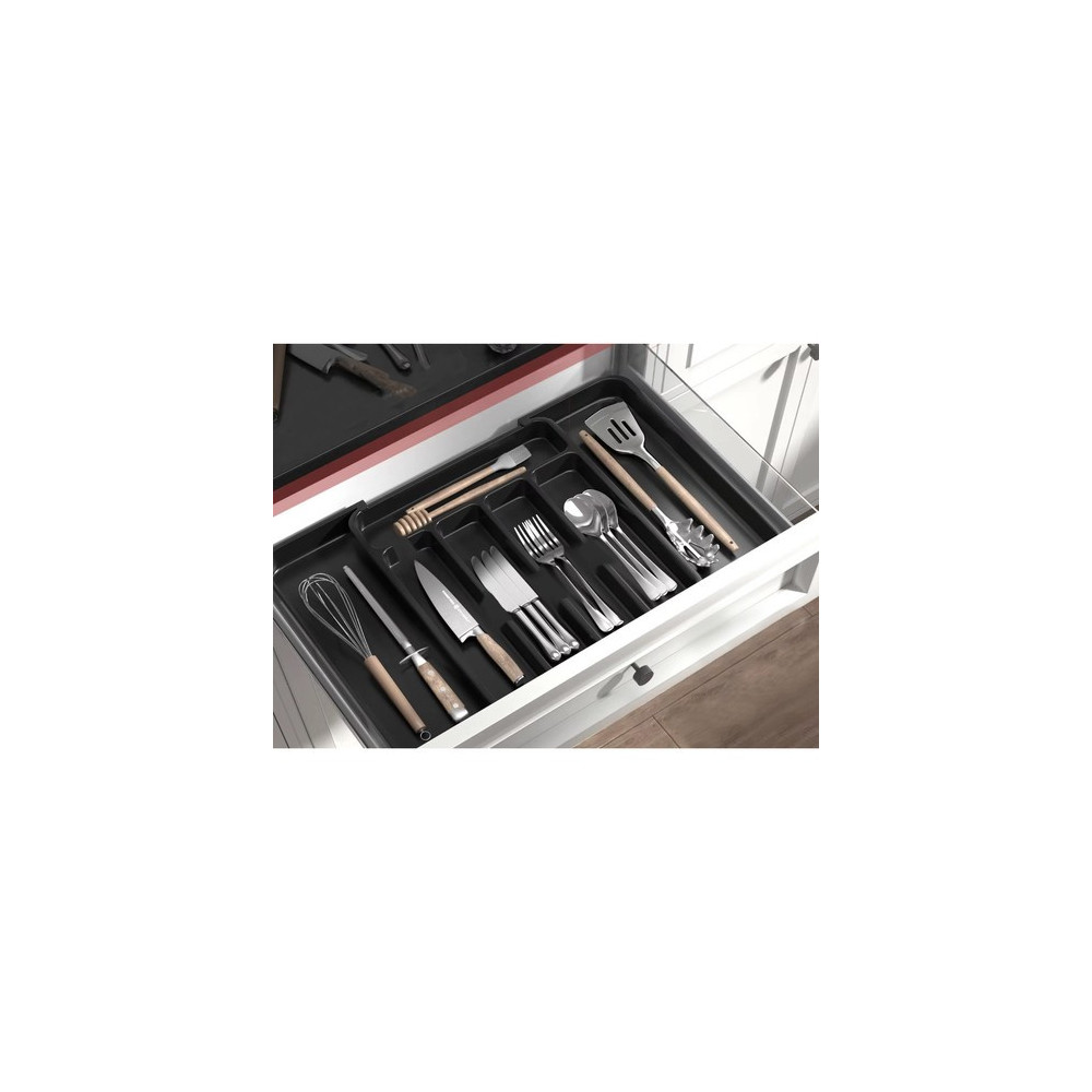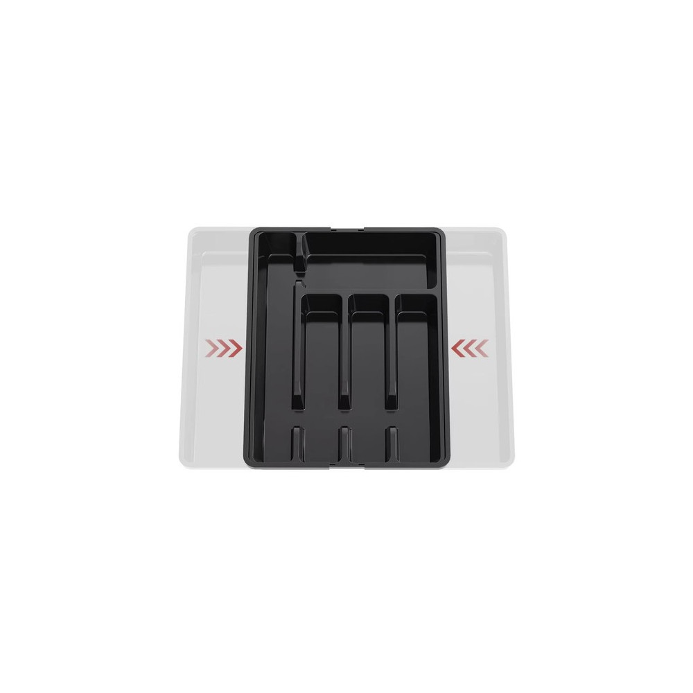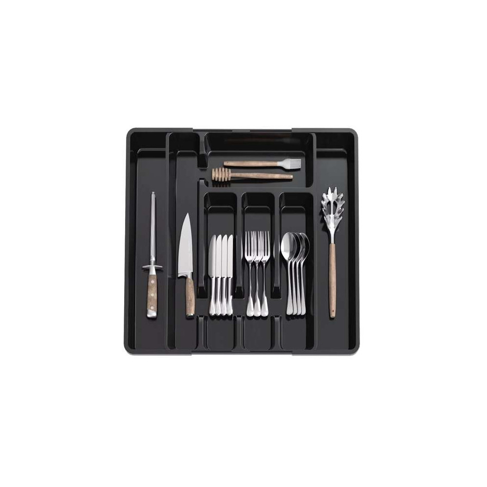 Černý organizér na příbory do kuchyňské zásuvky s výsuvným mechanismem. Lze jej tedy upravit na různé velikosti zásuvek, které zaručují univerzálnost a hodí se do malých i velkých zásuvek. Má hladký povrch, což usnadňuje čištění. Organizér má elegantní, moderní design v univerzální černé barvě a perfektně zapadne do každé kuchyně.