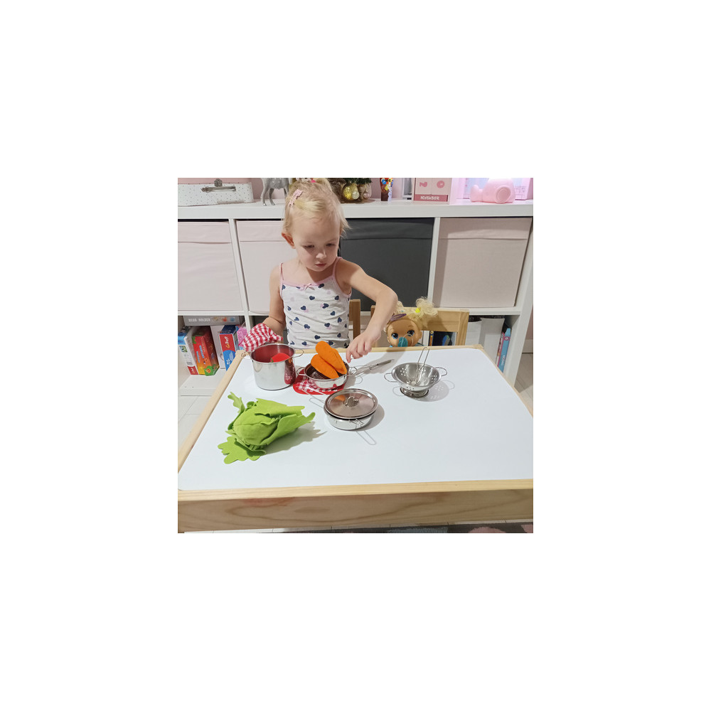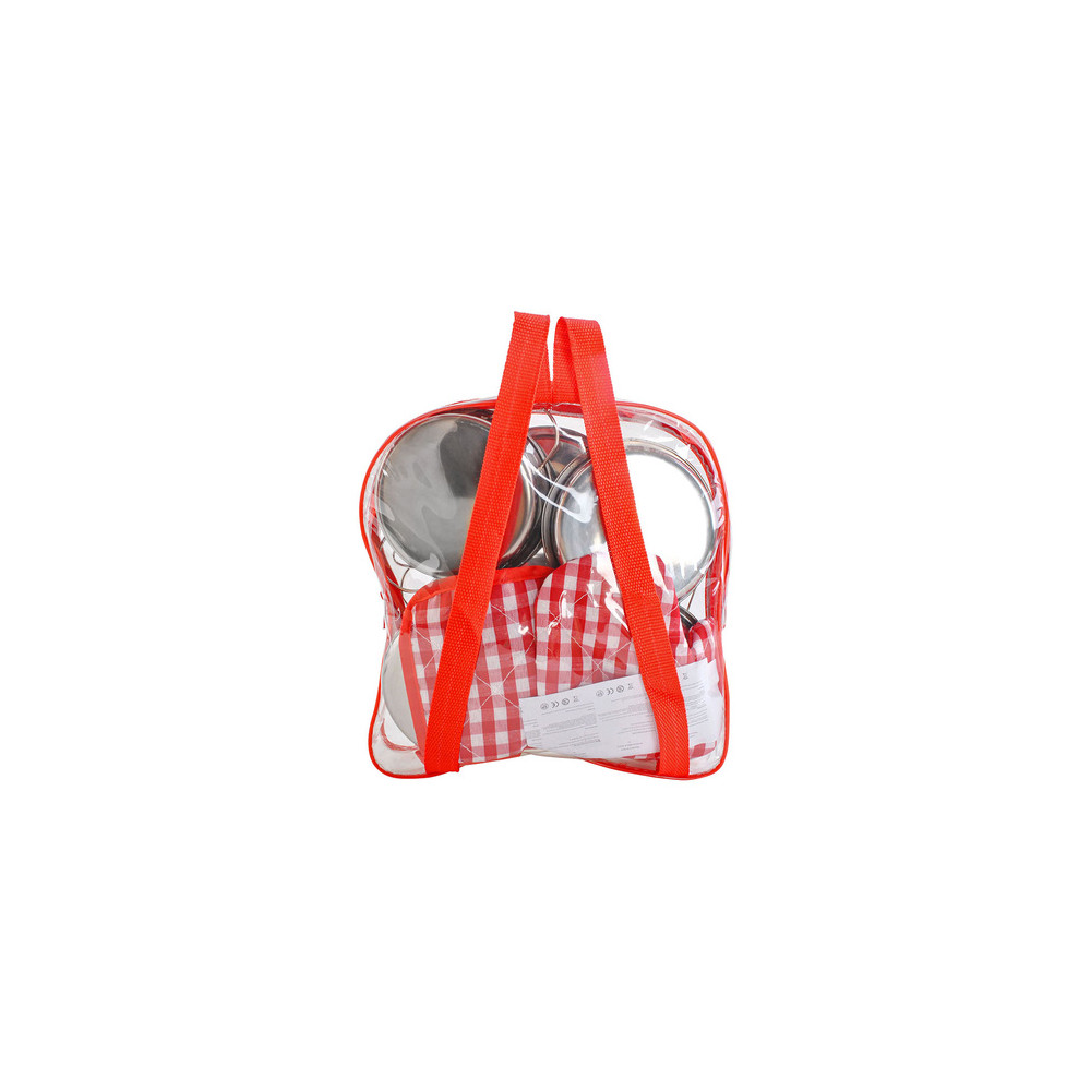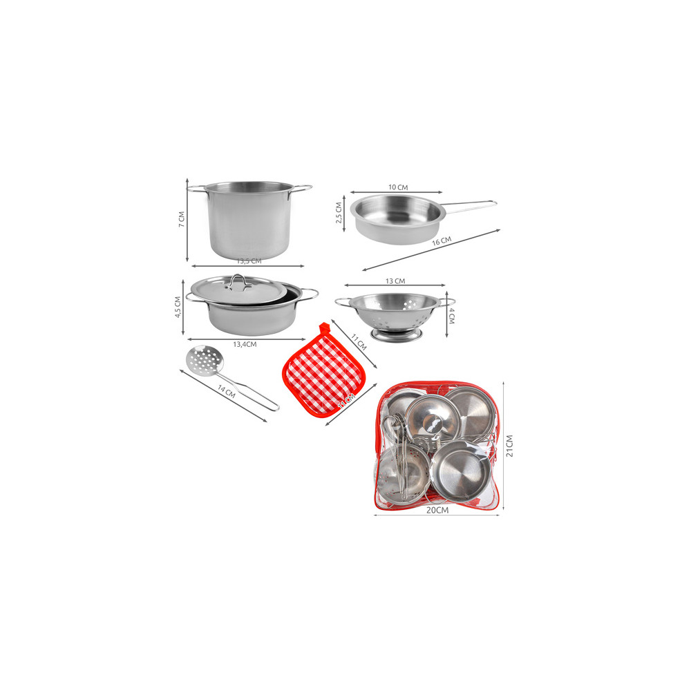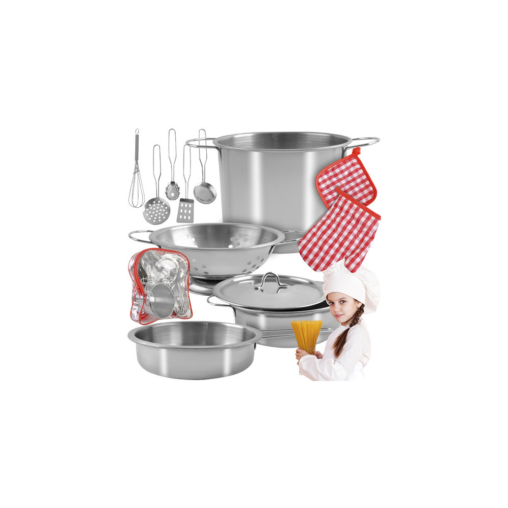 Sada stříbrného dětského nádobí, která vypadá jako opravdové nádobí profesionálních kuchařů. Vše je uloženo v průhledném batůžku, takže si děti mohou své nádobí pohodlně převážet. Hračka umožňuje nejen zajímavé a radostné trávení času, ale ovlivňuje i rozumový vývoj dítěte a růst jeho motoriky. Rozvíjí představivost a stimuluje kreativitu a také učí týmové práci a zlepšuje sociální a integrační dovednosti.