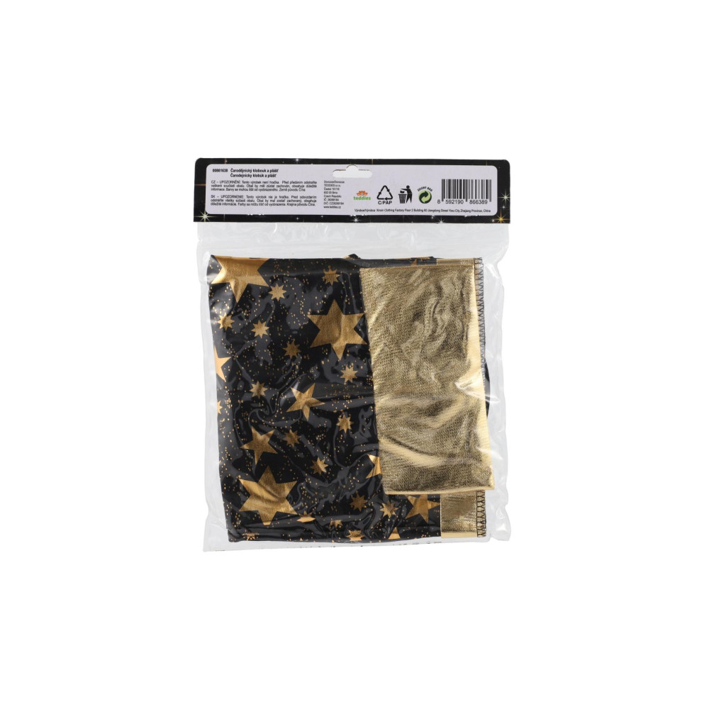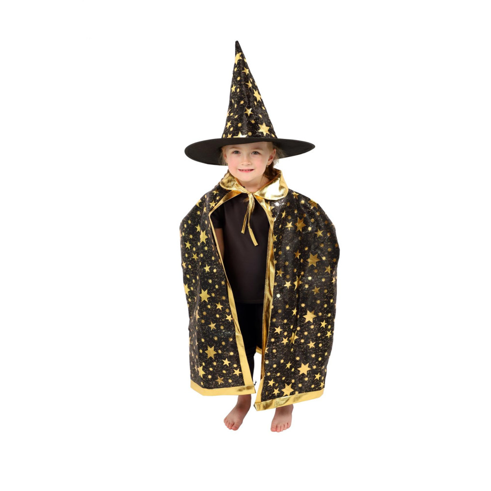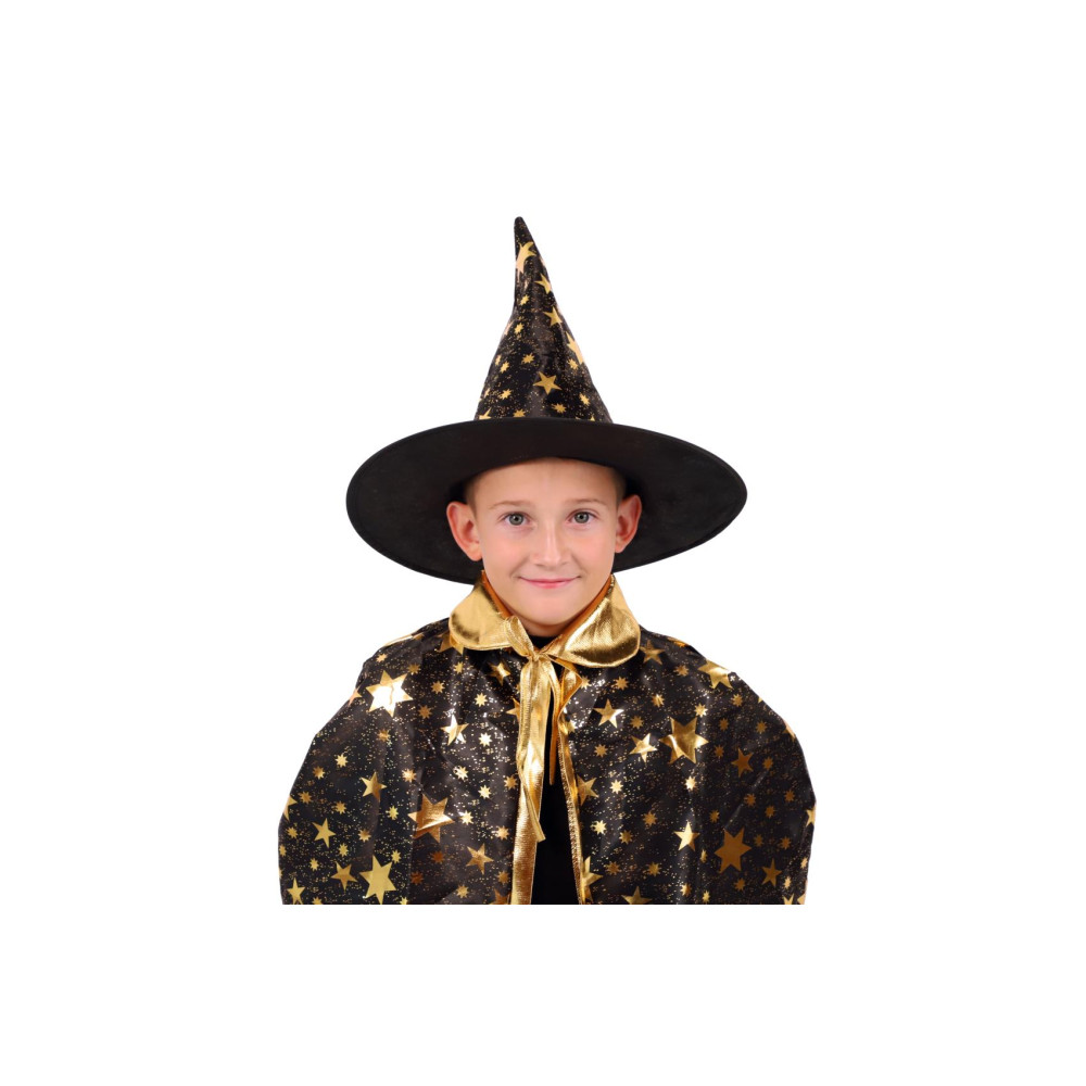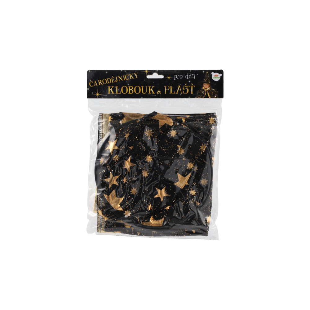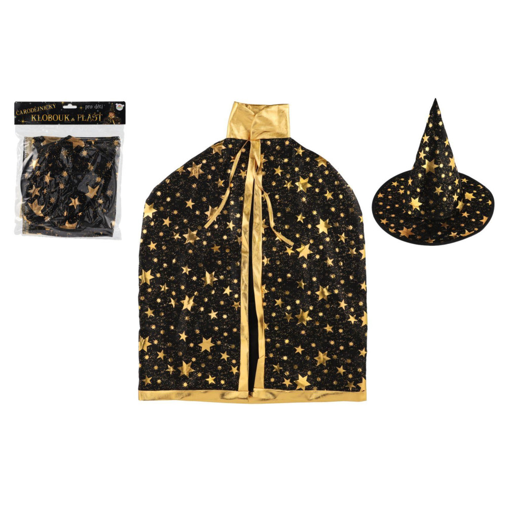 Dětský čarodějnický klobouk a plášť jsou inspirovány světem kouzel a magie. Mají černou barvu a jsou zdobené zlatými hvězdami, které vzbuzují čarodějnický dojem. Děti si mohou hrát na kouzelníky a kouzelnice, zkoumat svět kouzel a vytvářet své vlastní příběhy plné dobrodružství a fantazie.