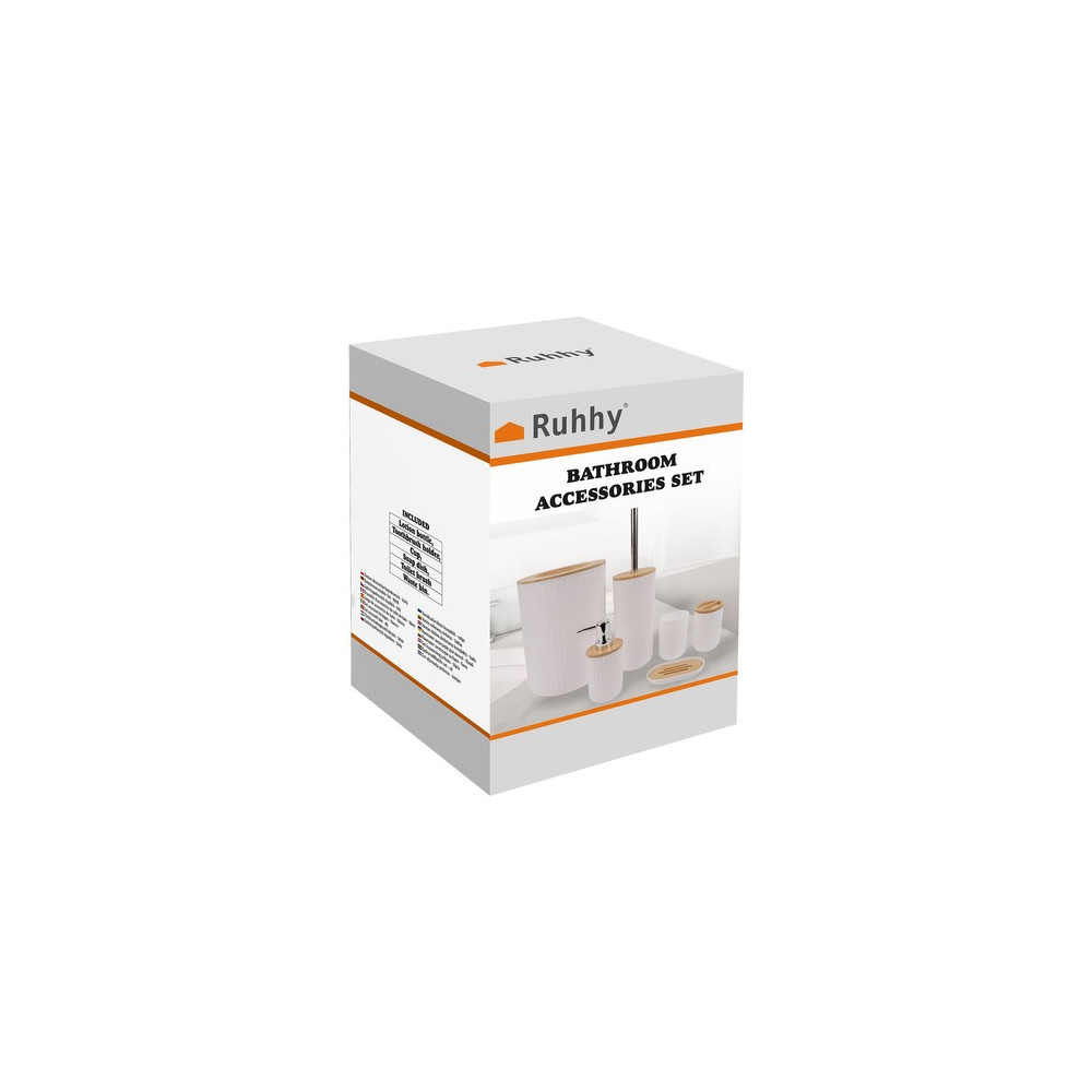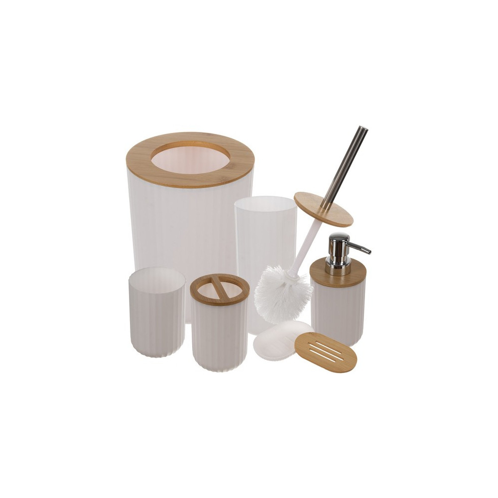 Obsahuje odpadkový koš, záchodovou štětku, dávkovač na mýdlo, kelímek na zubní kartáčky, kelímek na pastu na zuby a mističku na mýdlo.