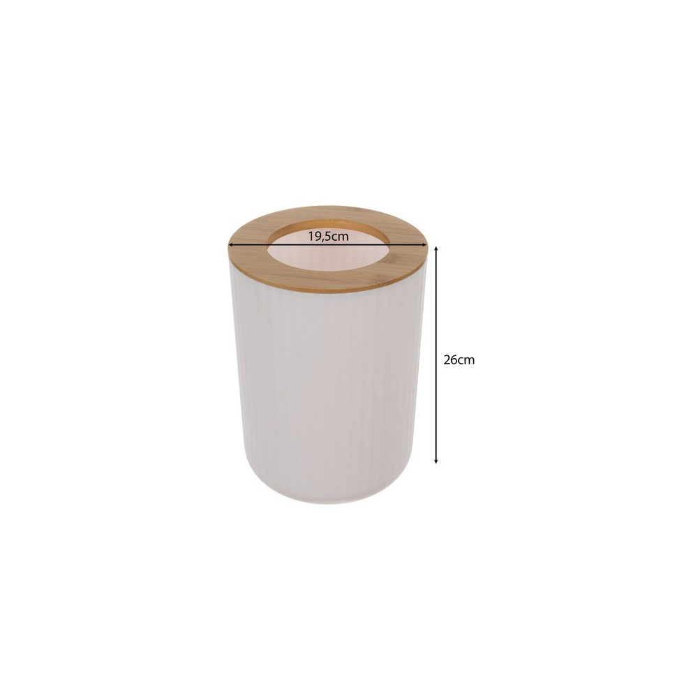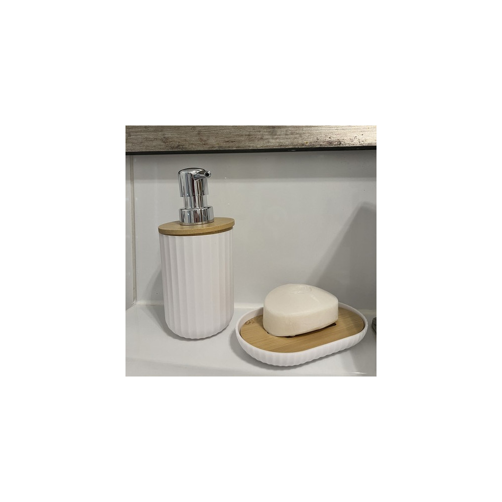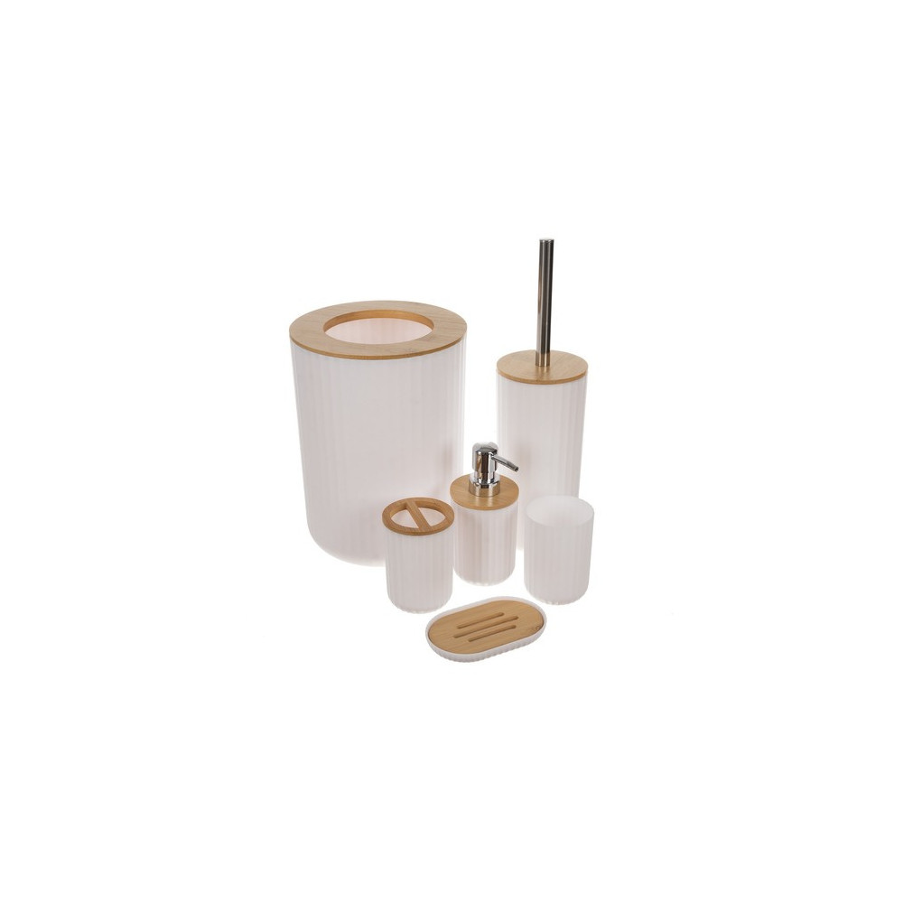 Elegantní sada koupelnových doplňků v bílé barvě s dekorem dřeva. Součástí sady je vše potřebné do každé moderní koupelny.