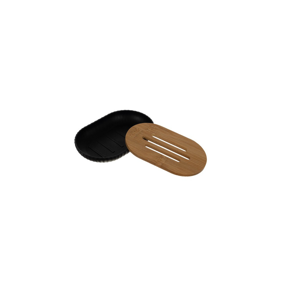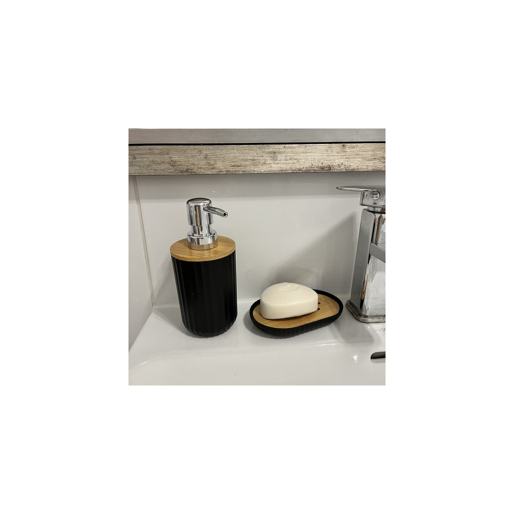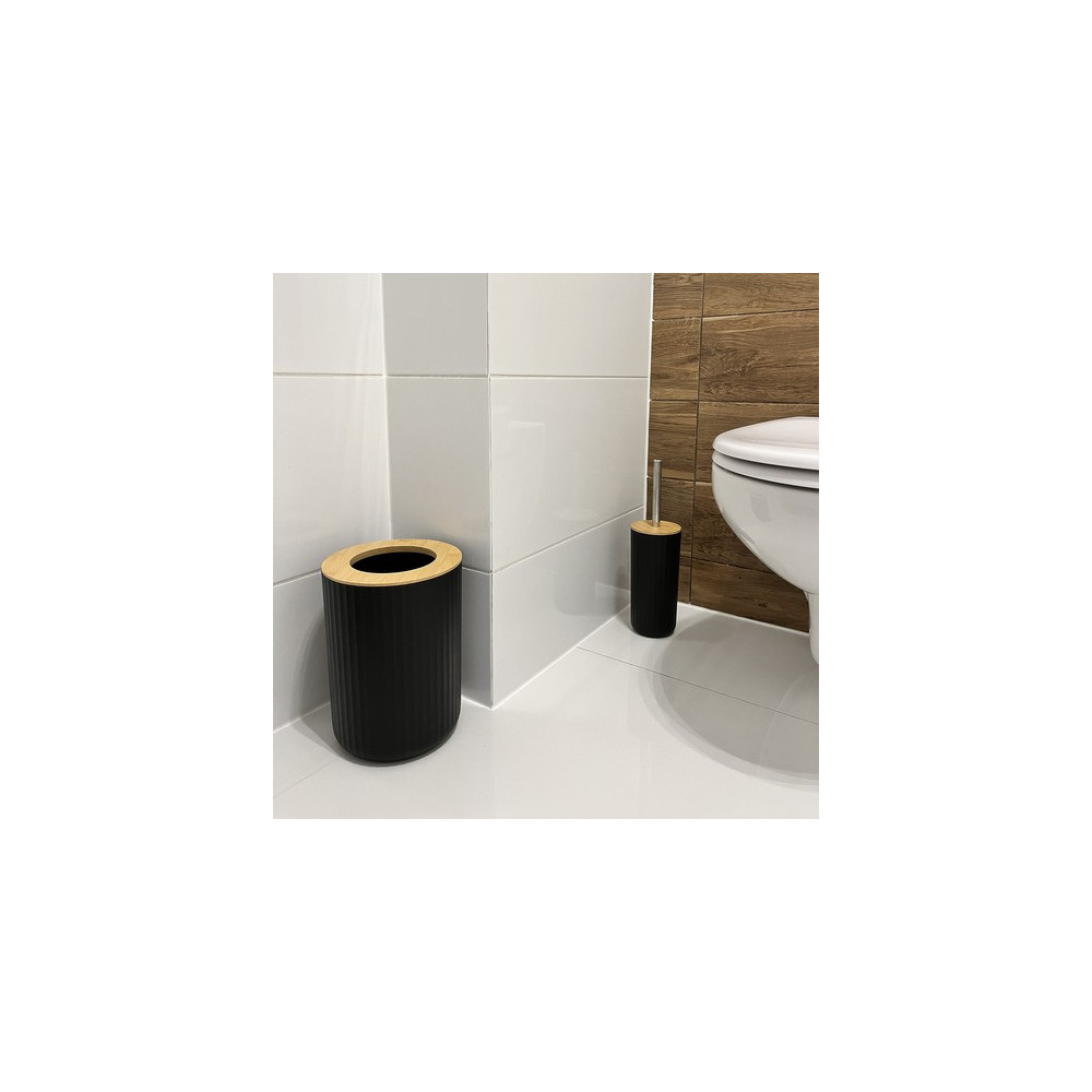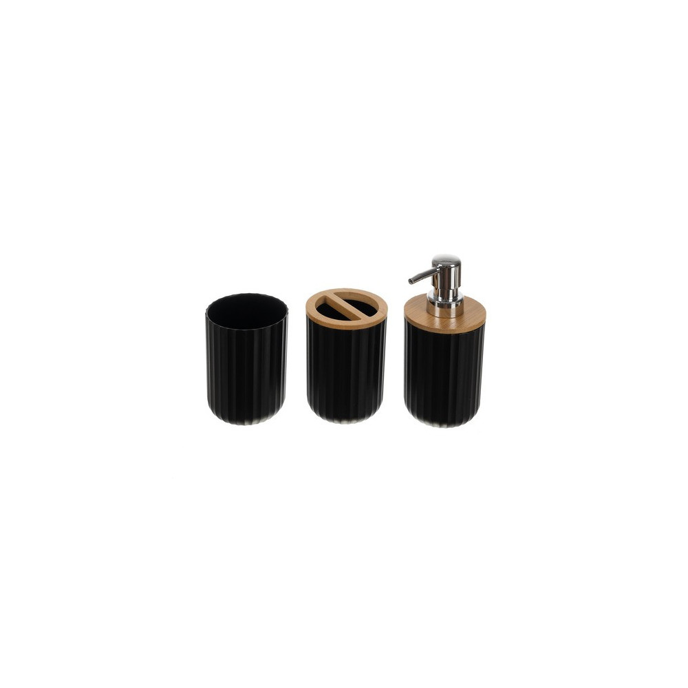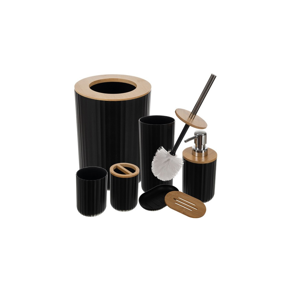 Elegantní sada koupelnových doplňků v černé barvě s dekorem dřeva. Součástí sady je vše potřebné do každé moderní koupelny.