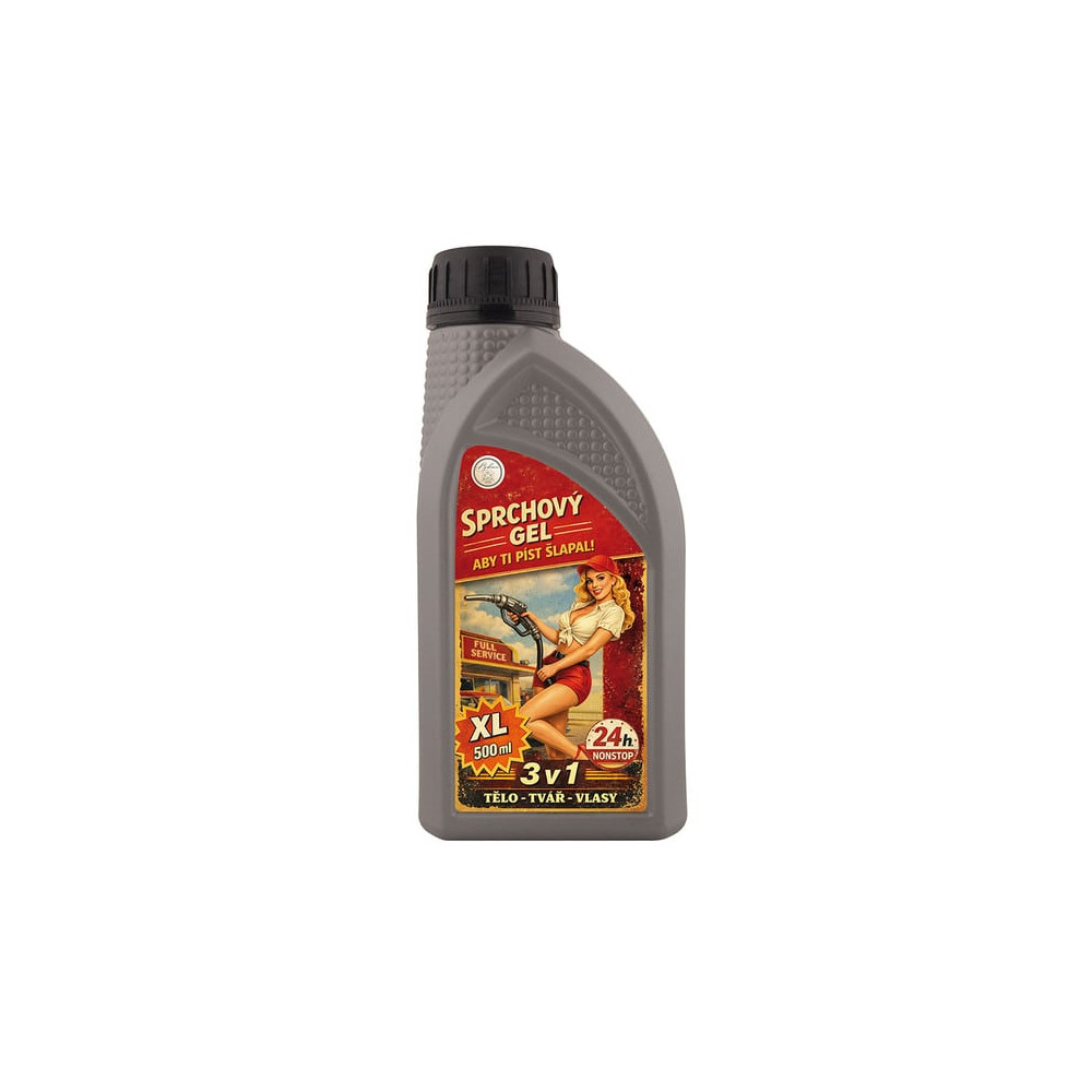 Retro sprchový gel pro muže 3v1 v industriální lahvi připomínající motorový olej. Motiv blondýnky a XL balení 500 ml vytváří originální dárek pro muže.