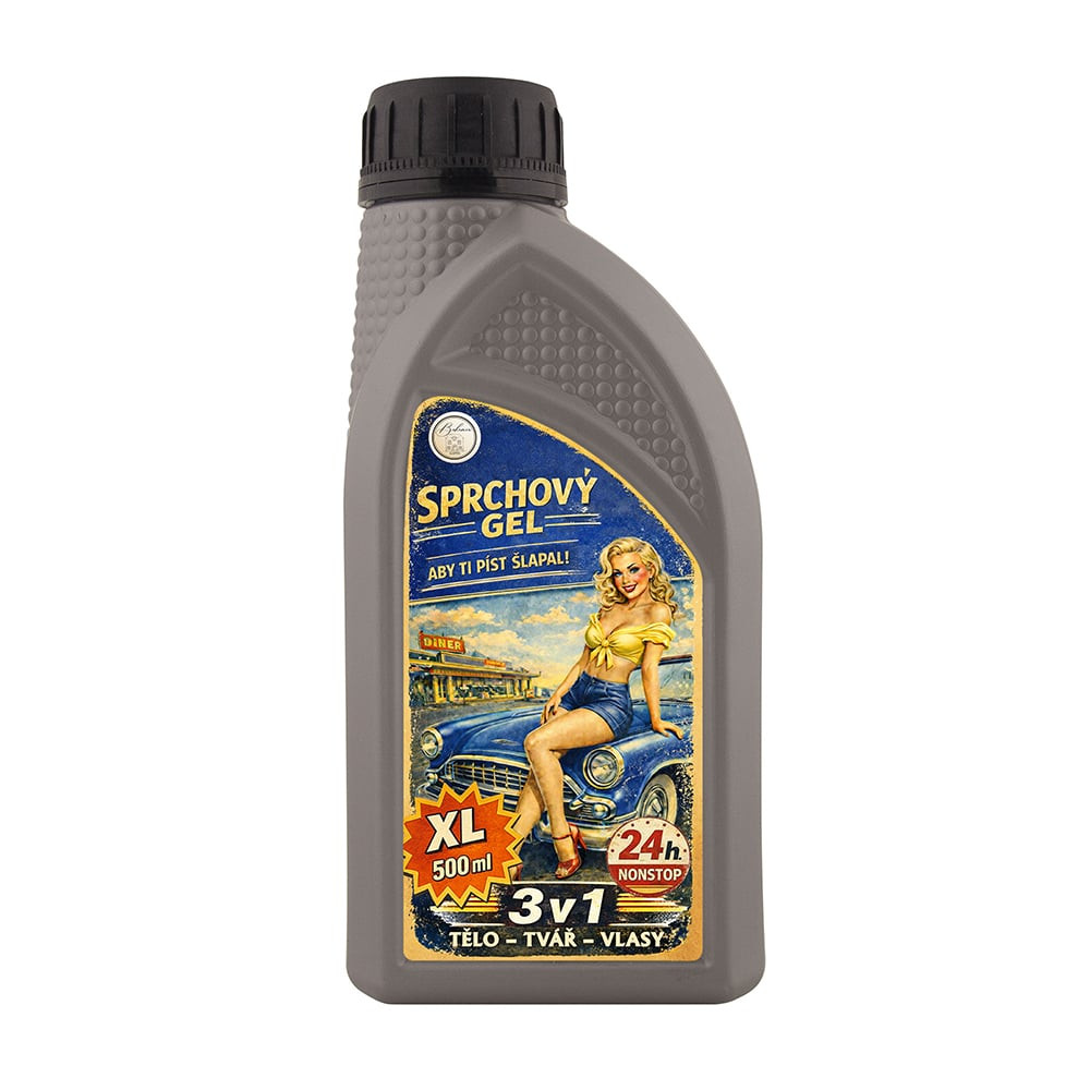 Retro sprchový gel pro muže 3v1 v industriální lahvi připomínající motorový olej. Motiv blondýnky a XL balení 500 ml vytváří originální dárek pro muže.