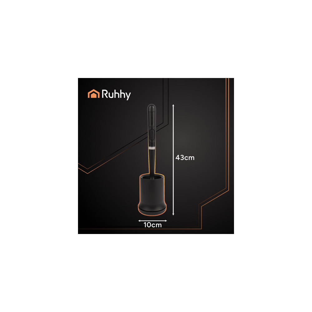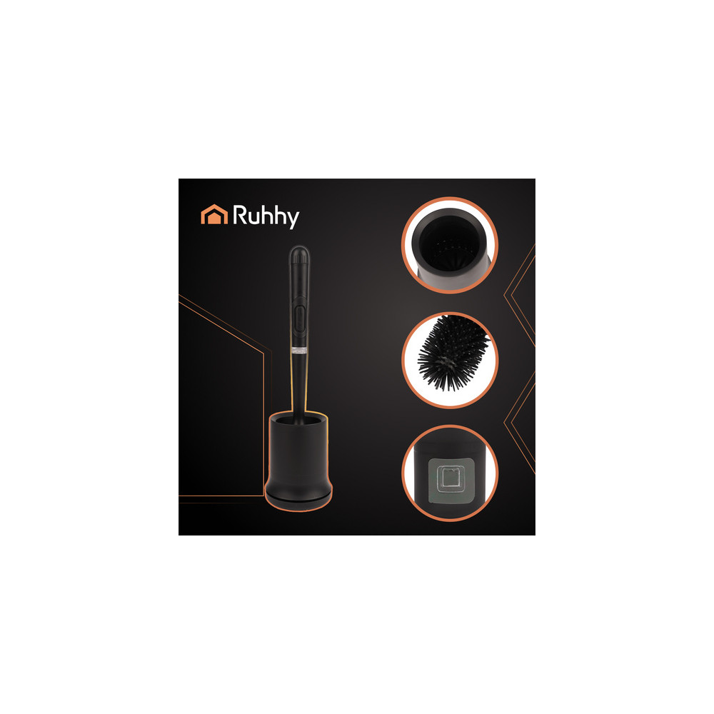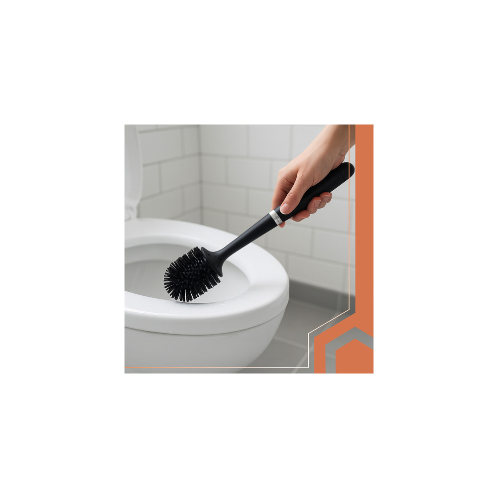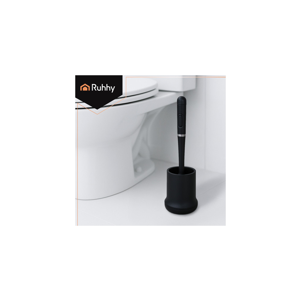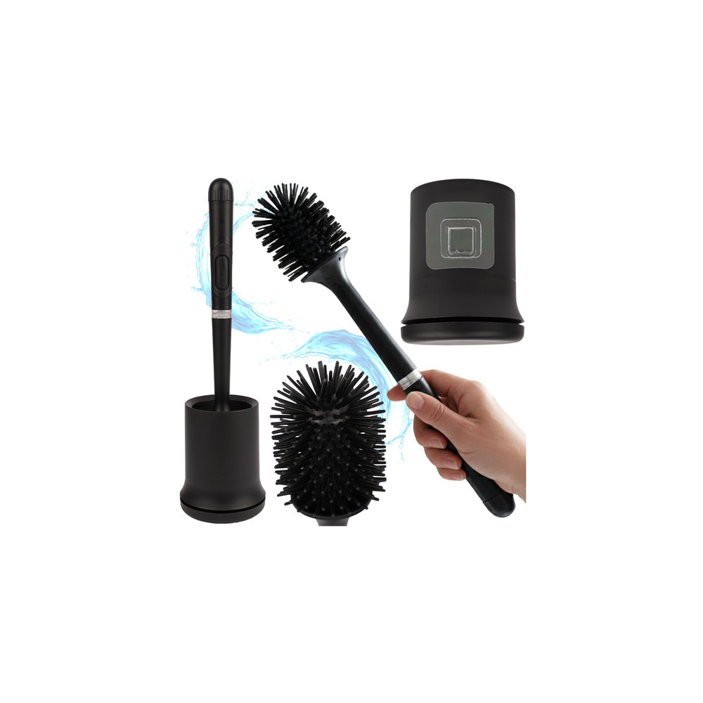 Černá záchodová štětka s dlouhou rukojetí a závěsnou nádobou v sobě spojuje pohodlí, hygienu a estetiku v jednom. Půlkruhová hlavice důkladně odstraňuje nečistoty a gumové štětiny kartáče nepoškrábou povrch záchodu.