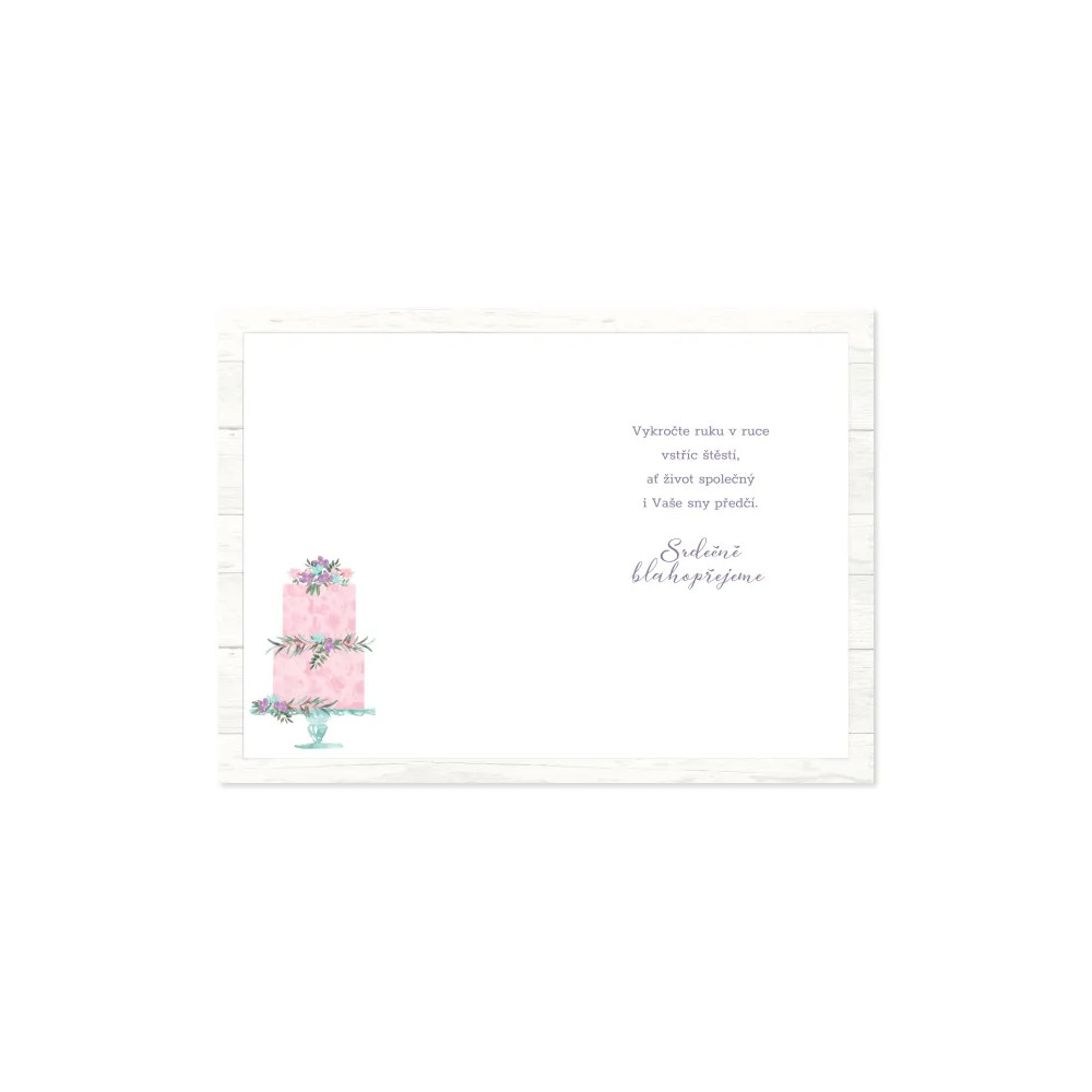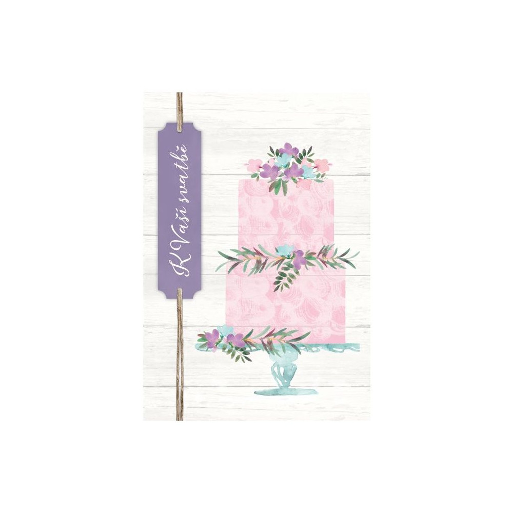 Darujte novomanželům papírové přáníčko a podtrhněte kouzlo svatebního dne. Klasické přání s s nápisem K Vaší svatbě zdobí fialovo-růžový dort s třpytivými květinami a lýková stuha. Uvnitř najdete krátké věnování a zároveň dostatek místa pro Váš vzkaz a podpis.