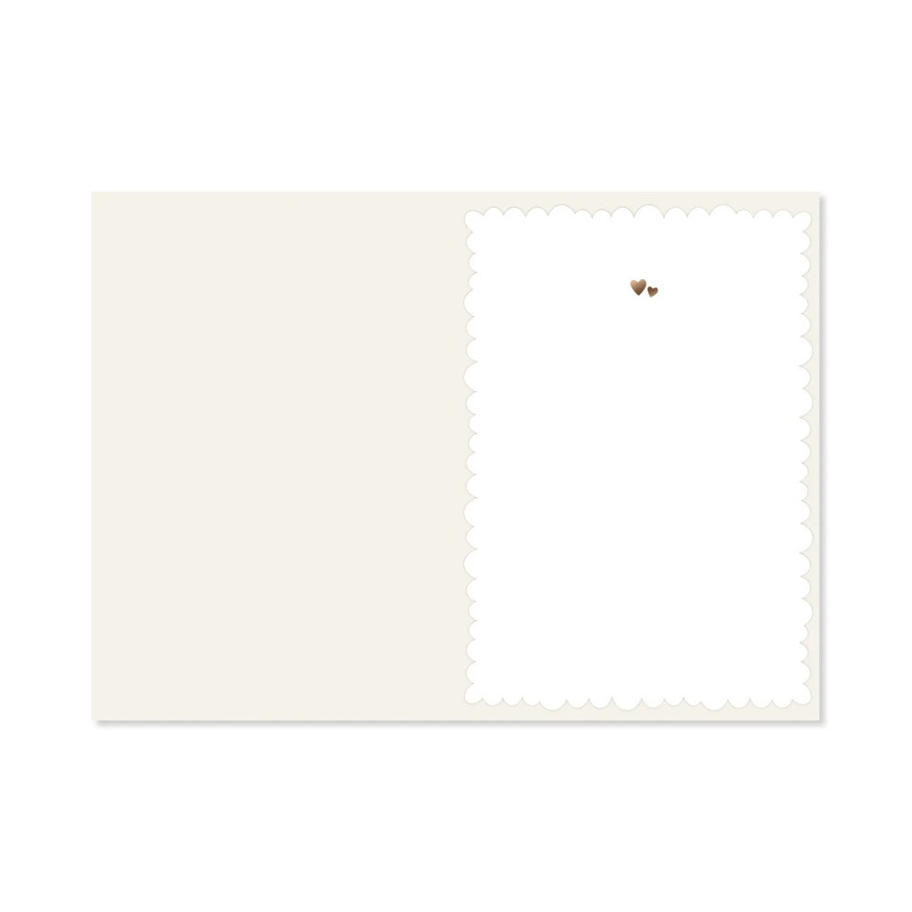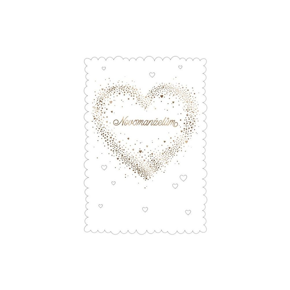 Darujte novomanželům papírové přáníčko a podtrhněte kouzlo svatebního dne. Elegantní přání s vyraženým srdíčkovým motivem zdobí zlatá ražba a nápis Novomanželům. Uvnitř najdete dostatek místa pro Váš vzkaz a podpis.