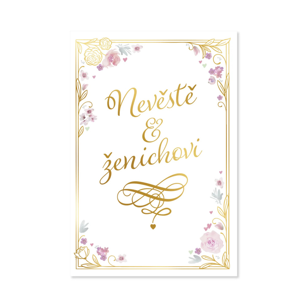 Darujte novomanželům papírové přáníčko a podtrhněte kouzlo svatebního dne. Klasické přání s s nápisem Nevěstě a ženichovi zdobí jemné květiny a zlatá ražba. Uvnitř najdete krátké věnování a zároveň dostatek místa pro Váš vzkaz a podpis.