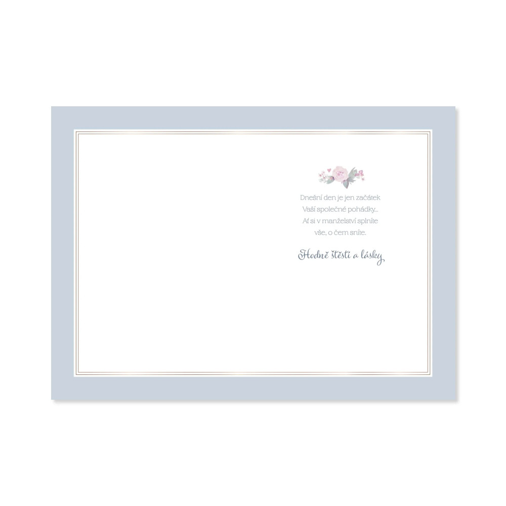 Text přání: Nevěstě a ženichovi. Dnešní den je jen začátek Vaší společné pohádky… Ať si v manželství splníte vše, o čem sníte. Hodně štěstí a lásky