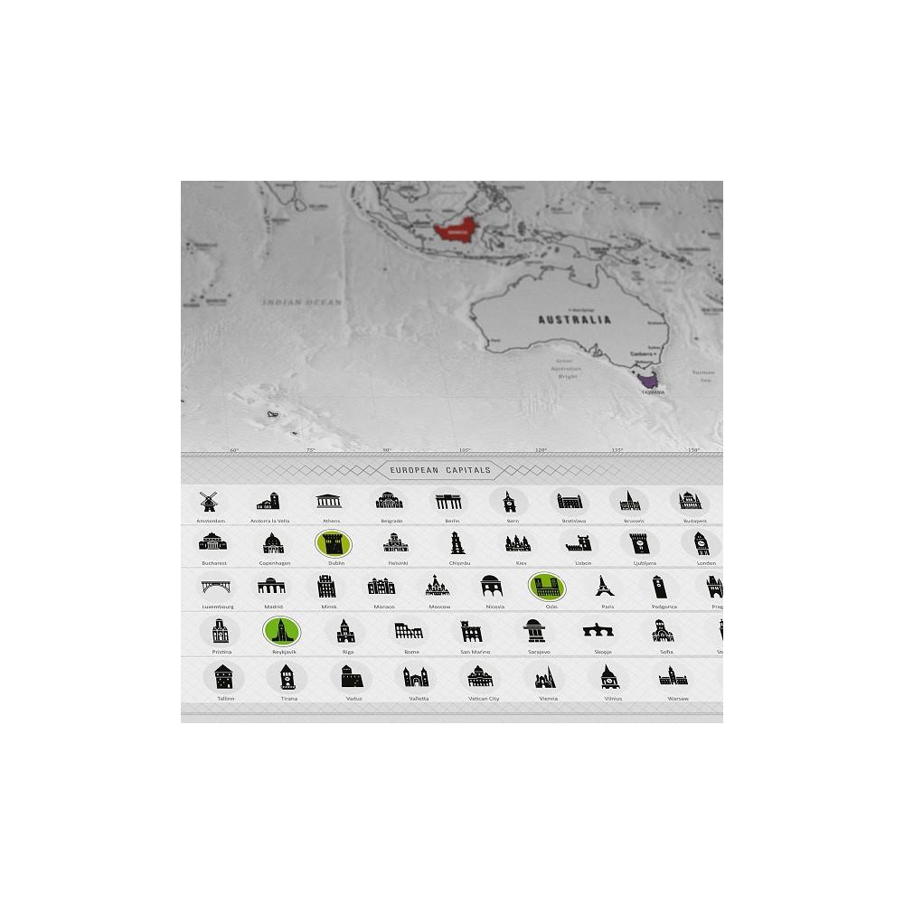 Důraz na detail: Výrobce si dal záležet na tom, aby mapa potěšila každého - každý kousek mapy je ručně malovaný, včetně vrstvy pro stírání, takže mapa je krásná ještě předtím, než ji seškrábete.