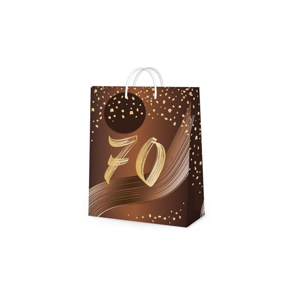 Máte koupený dárek a potřebujete ho rychle zabalit, aby i jako dárek vypadal? S papírovou taškou od Albi už to nemůže být snadnější. Stačí předmět do tašky vložit a můžete rovnou gratulovat. Luxusní dárková taška se zlatou ražbou na hnědém pozadí je vhodná na zabalení dárku pro oslavence 70. narozenin či na výročí.