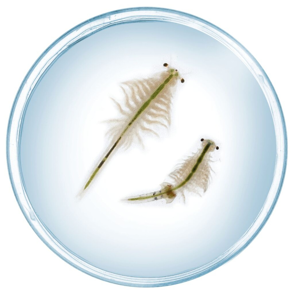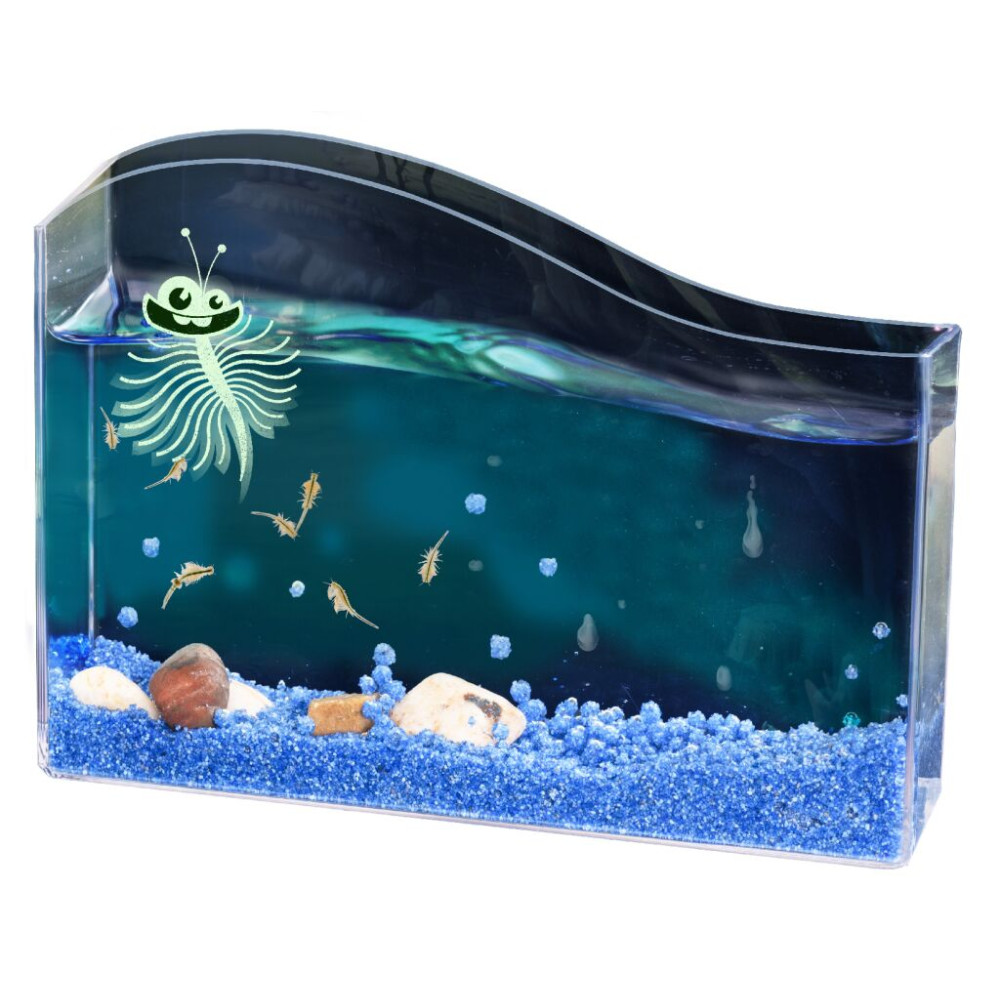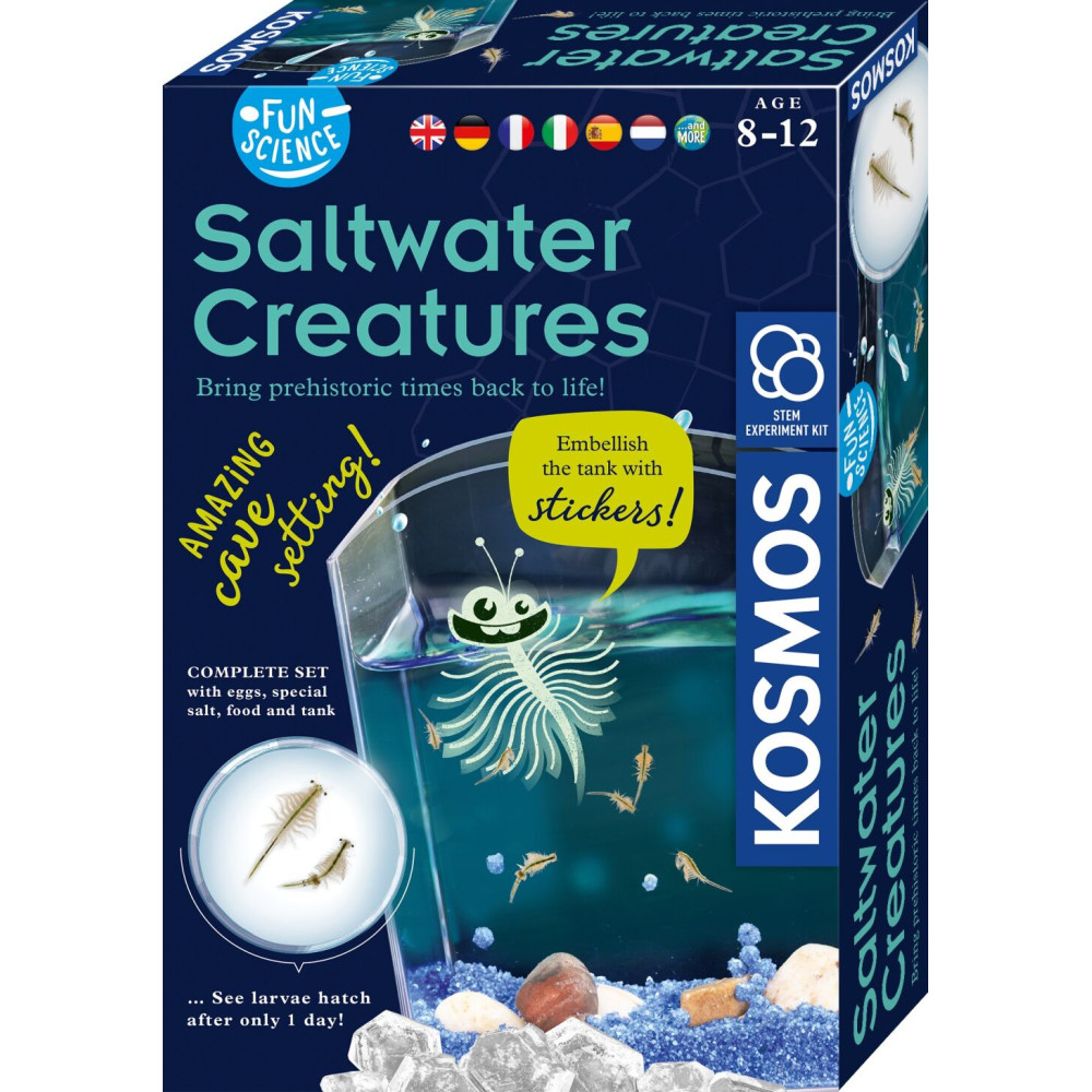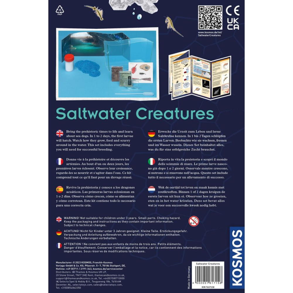 Vodní mazlíček žábronožka solná v balení od značky Kosmos. Obsahuje nádrž na chování žábronožek, speciální sůl, krmení, vajíčka, původní obrázkový návod v angličtině a přiložený český překlad. Český návod ke stáhnutí v digitální podobě - QR kód na krabici a v návodu.