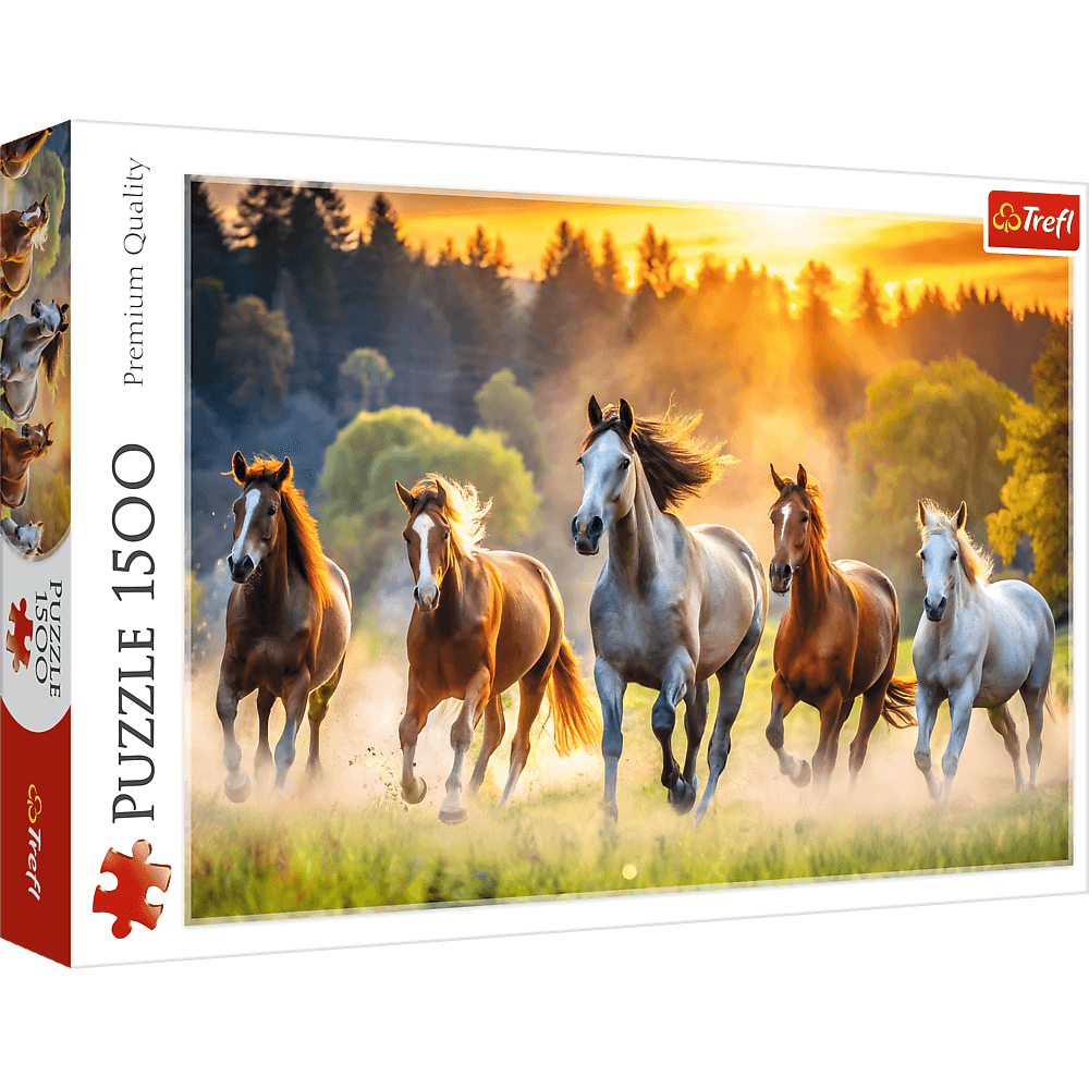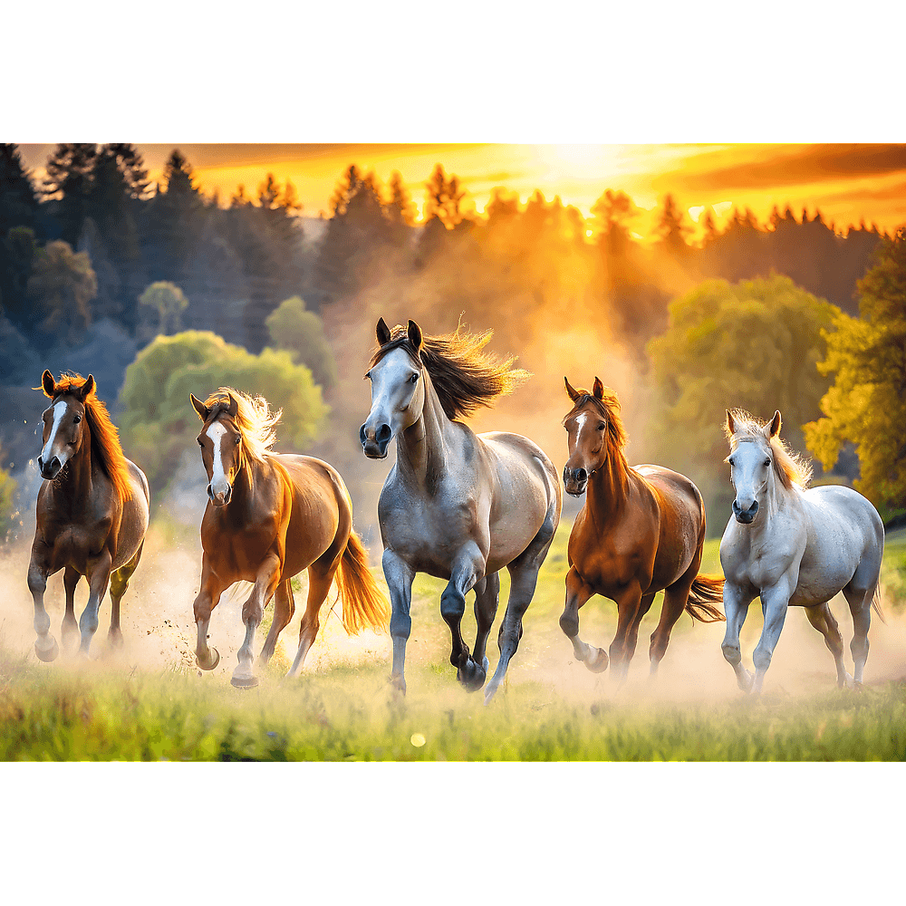 Papírové puzzle od značky Trefl s motivem divokých koní při západu slunce.