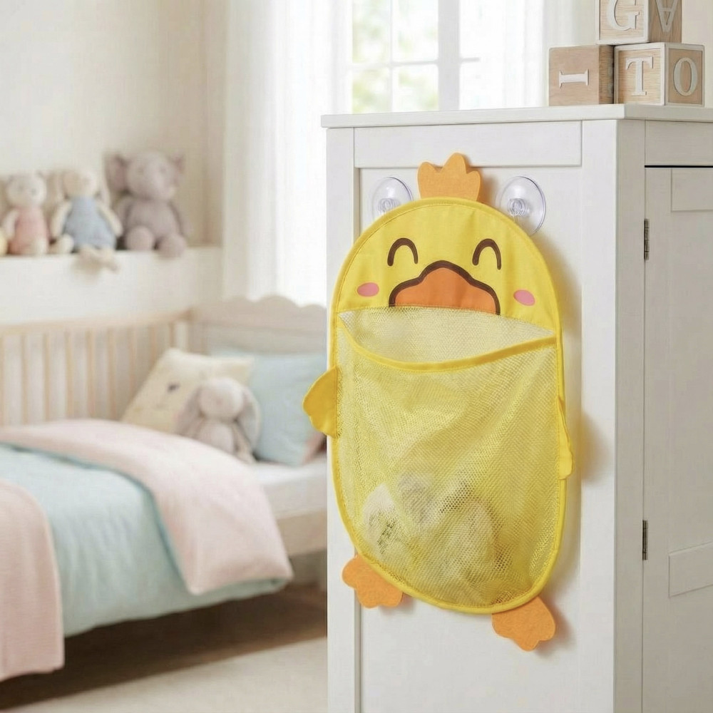 Hravý design ve tvaru žluté kachny s veselým výrazem a pestrými barvami přitahuje pozornost dětí a motivuje je k pořádku. Organizér se jednoduše zavěsí na stěnu, dveře nebo bok skříně, šetří místo a je vyroben z odolného materiálu vhodného pro děti.
