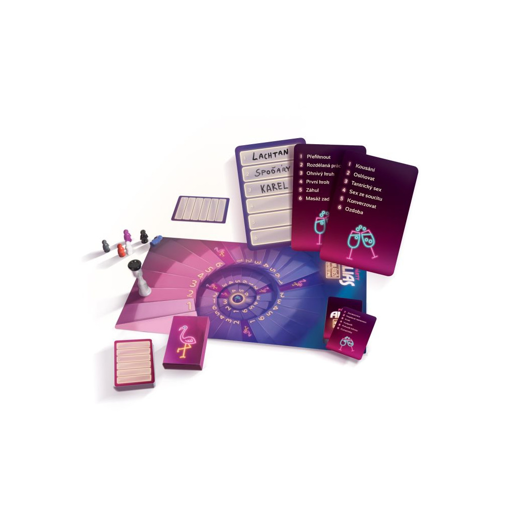 Hra obsahuje: 400 karet, 6 plastových ?gurek, přesýpací hodiny, krabičku nočního klubu, tužku a pravidla.